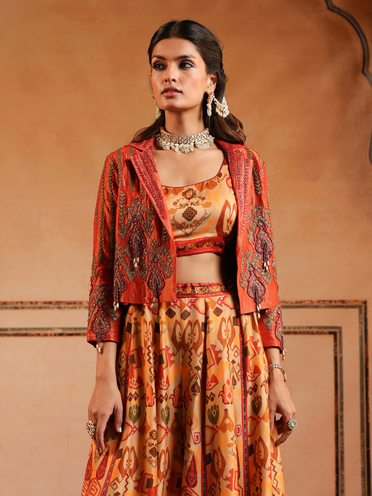 Soft as moonlight, this cream silk printed palazzo suit comes with a long jacket for regal flair. Embellished with sequins, cutdana, and beads, its detailing gleams with luxury. A wedding and festive treasure, the attire exudes grace and timeless celebration charm.