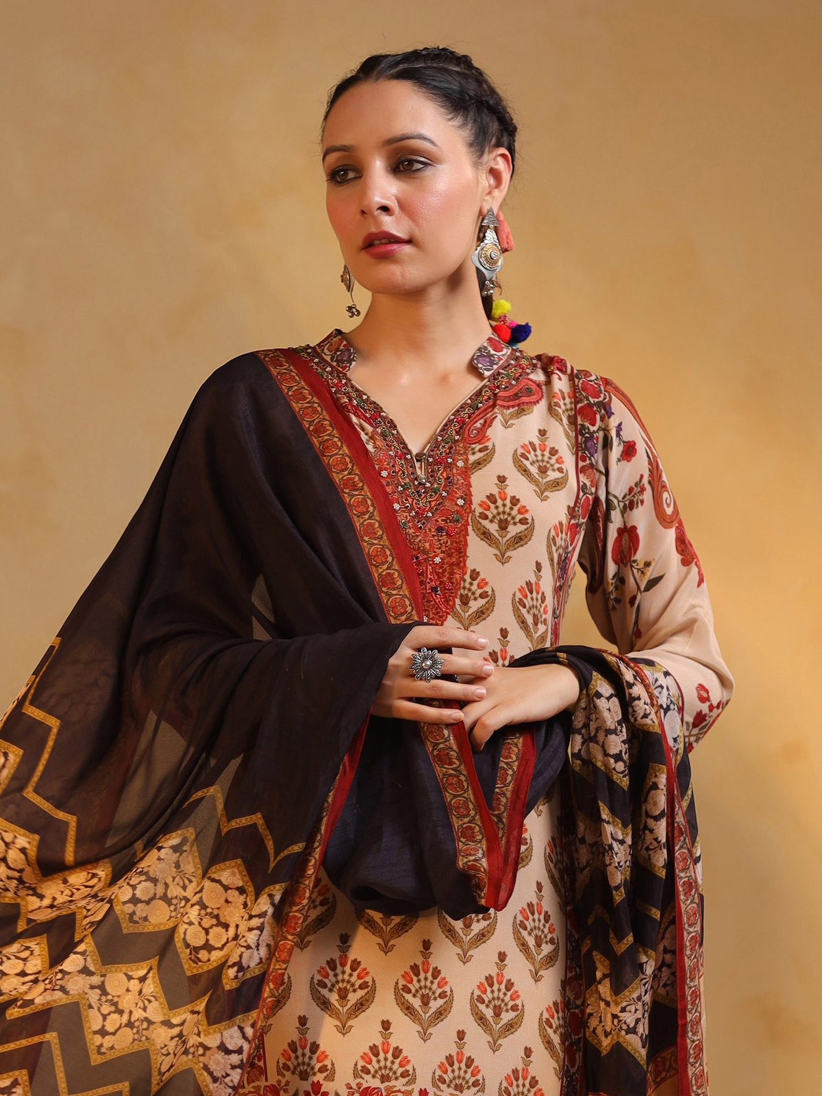 This cream and black silk printed salwar suit features sequins, thread, and bead work. Designed with a stand neckline and quarter sleeves, styled with pant and dupatta, it makes an elegant festive outfit with timeless appeal.