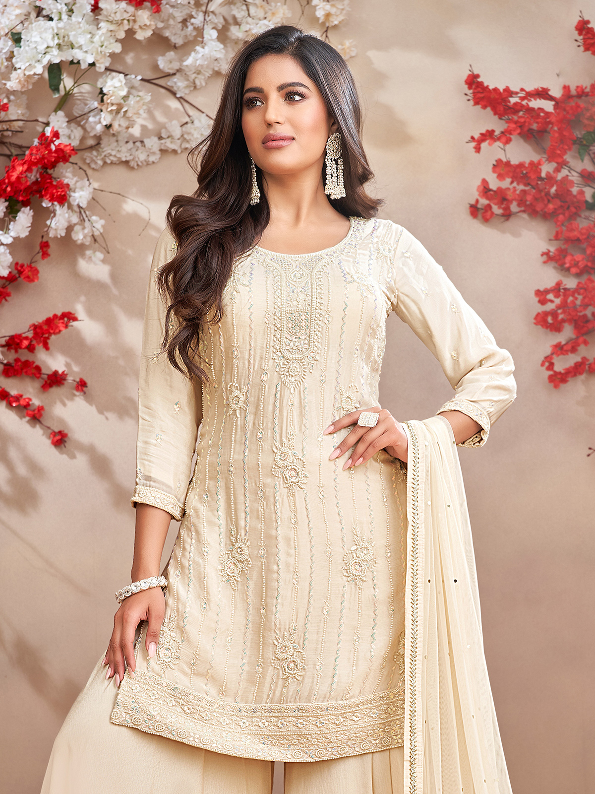 Step into elegance with this cream chiffon palazzo suit, designed in a graceful Pakistani cut. Embellished with delicate cutdana, sequins, and beads, it features a round neckline, quarter sleeves, and flowing palazzo pants. Paired with a matching dupatta, it’s a timeless outfit for weddings and sangeet ceremonies.