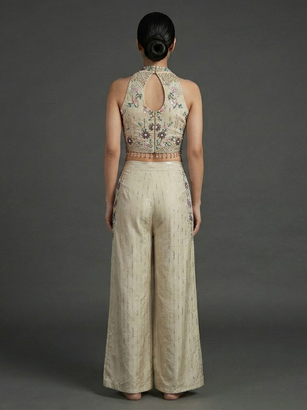 Cream Cotton Silk Embellished Halter Neck Palazzo Suit