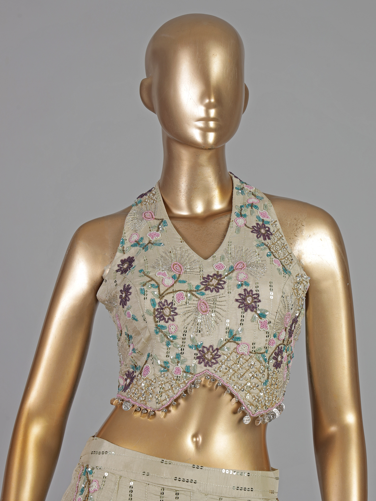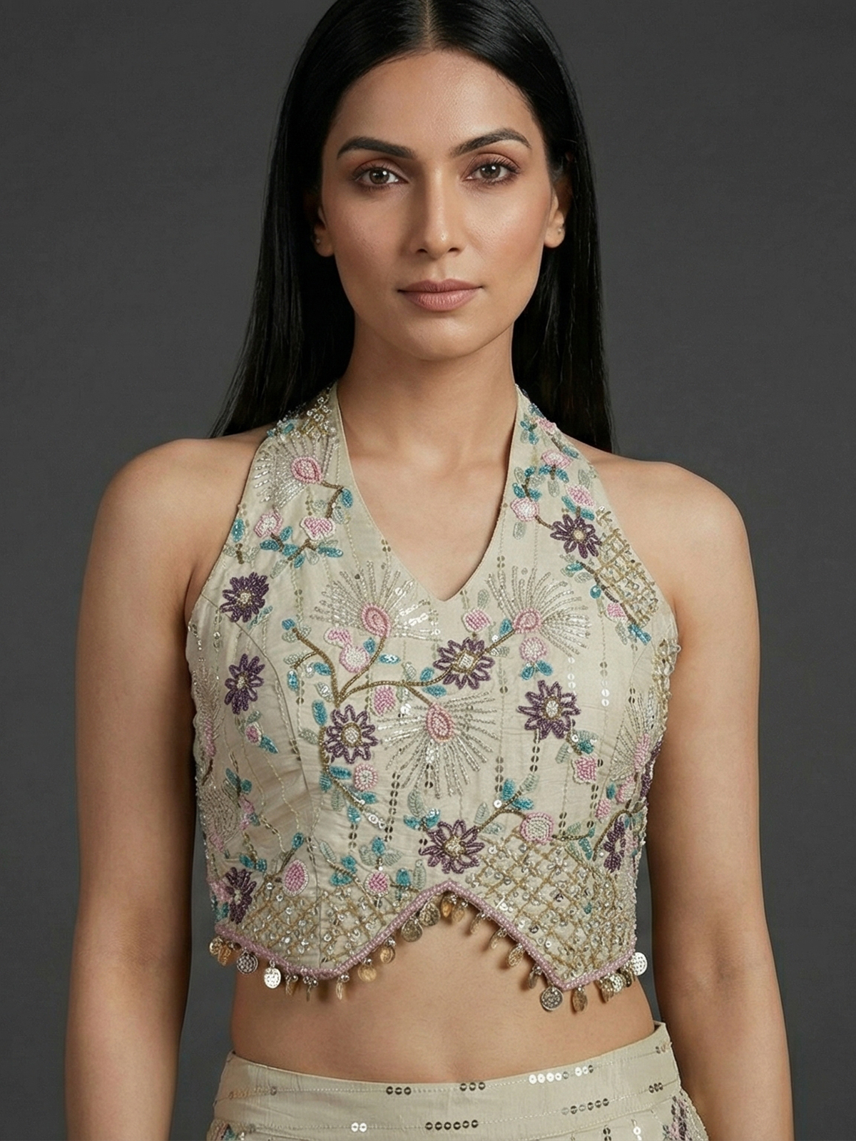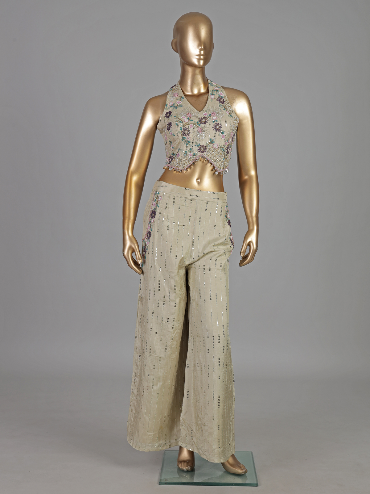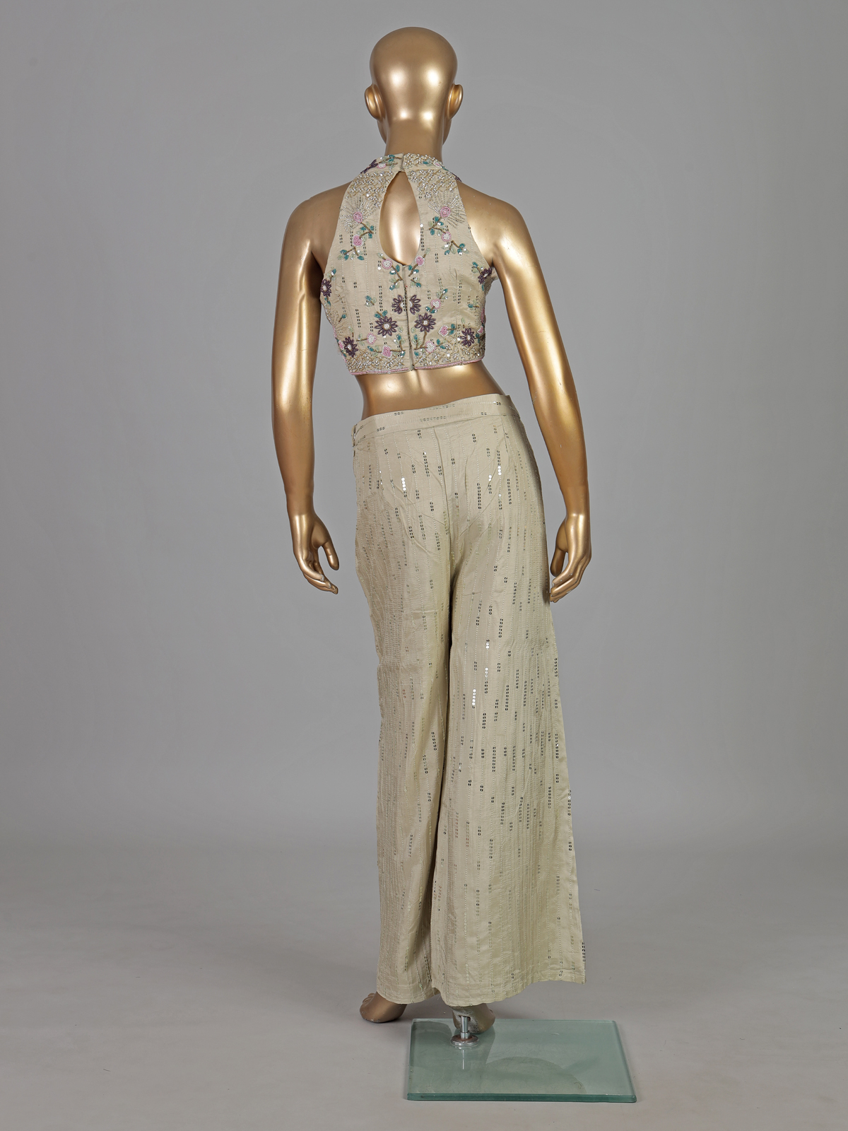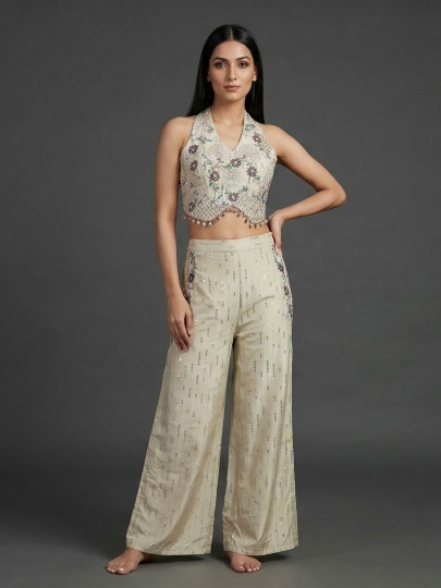 Soft cream tones reflect refined elegance in this cotton silk palazzo suit crafted for grand occasions. Adorned with sequins, coins, cutdana, beads and thread work. It glimmers beautifully. The halter neckline and sleeveless design add modern charm. Paired with flowing palazzo pants. This ensemble is perfect for weddings, receptions and sangeet celebrations.
