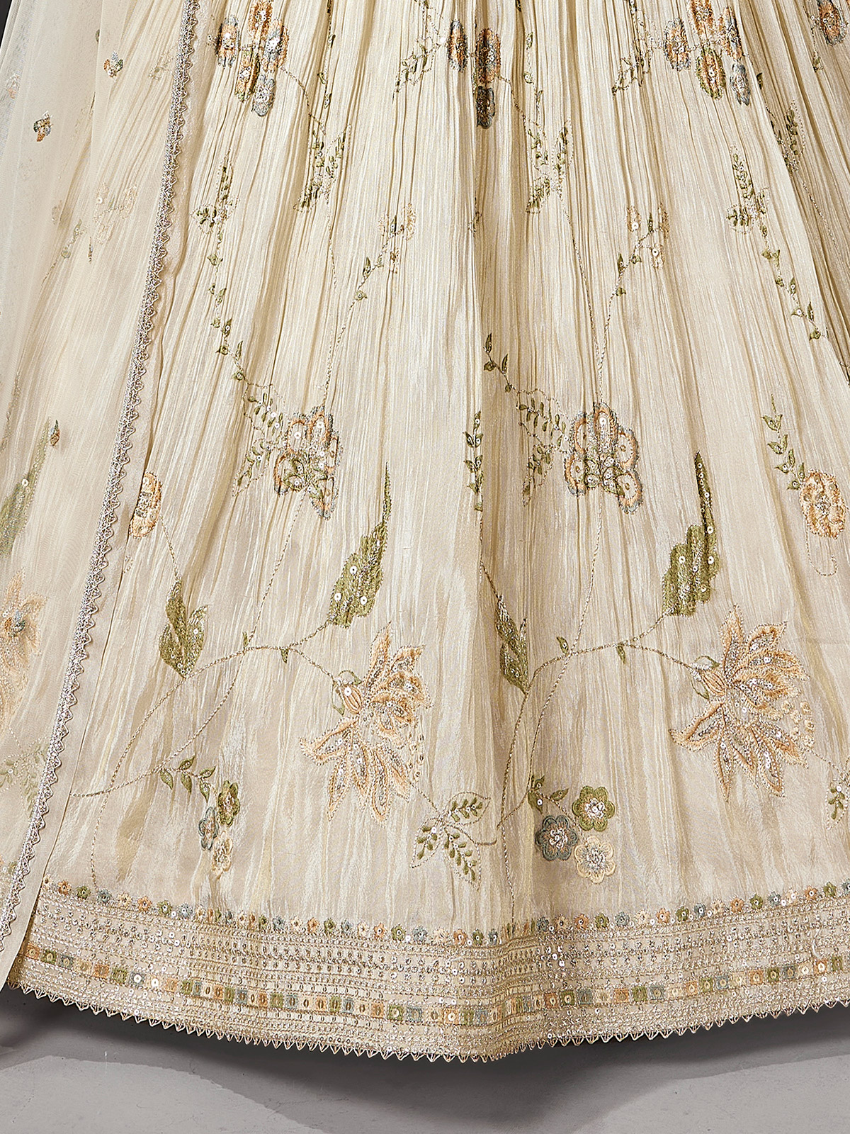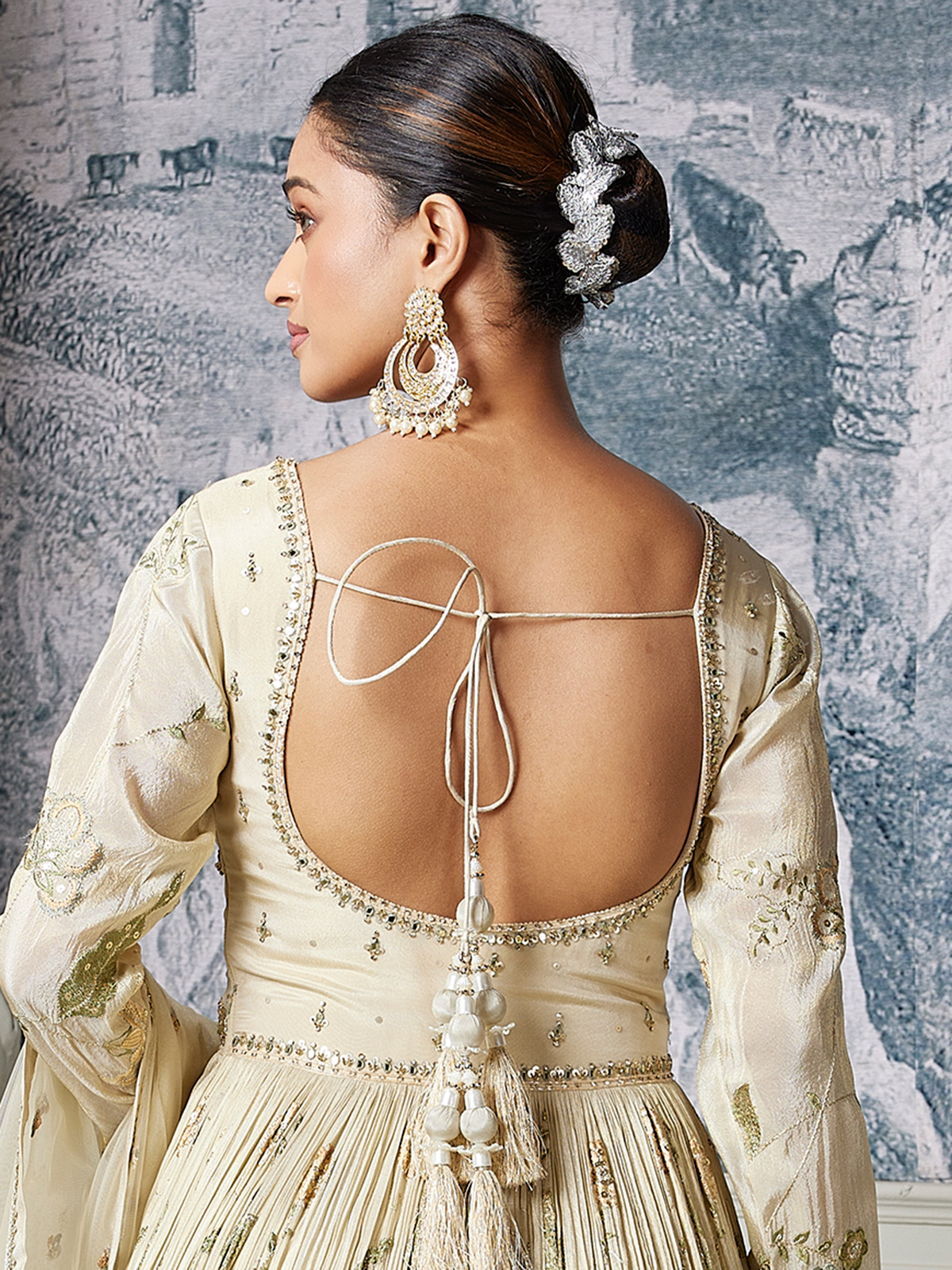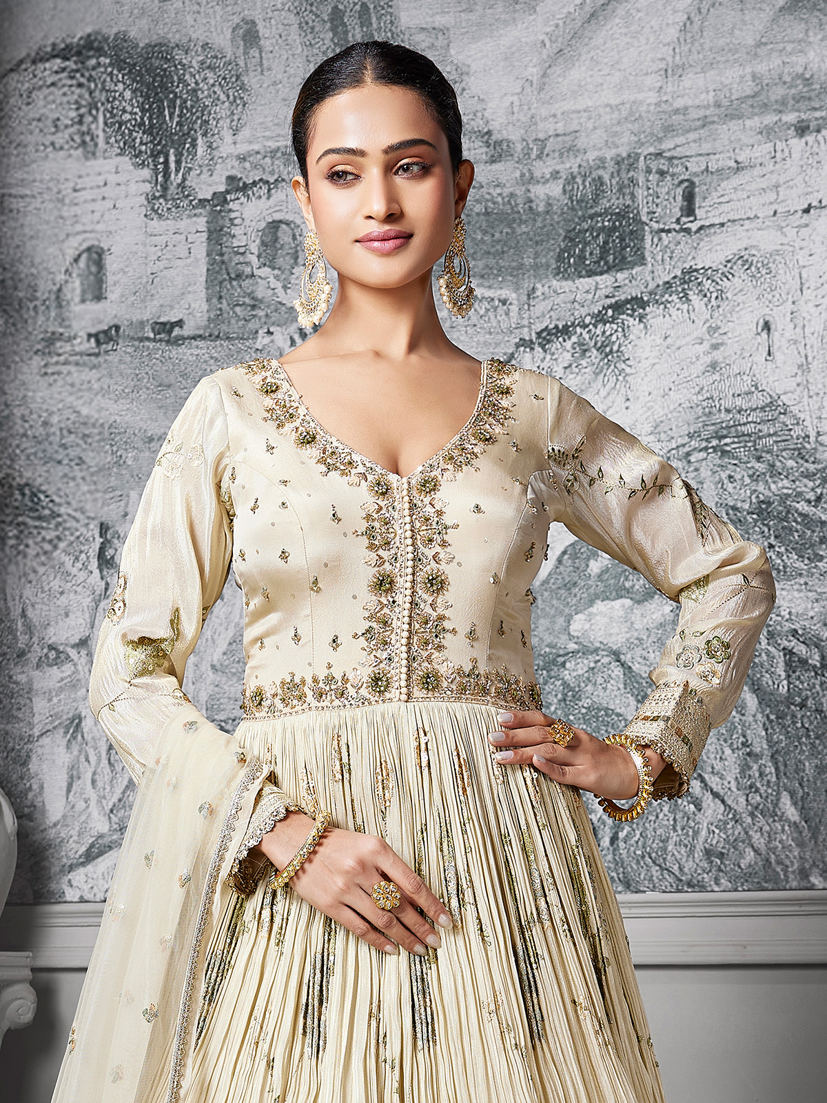 Crafted in elegant cream silk anarkali suit. Showcases embroidery enhanced with sequins, mirror, cutdana, zardosi and diamond detailing. Styled with a V neckline and full sleeves, it is paired with a dupatta, making it ideal for weddings and reception events.