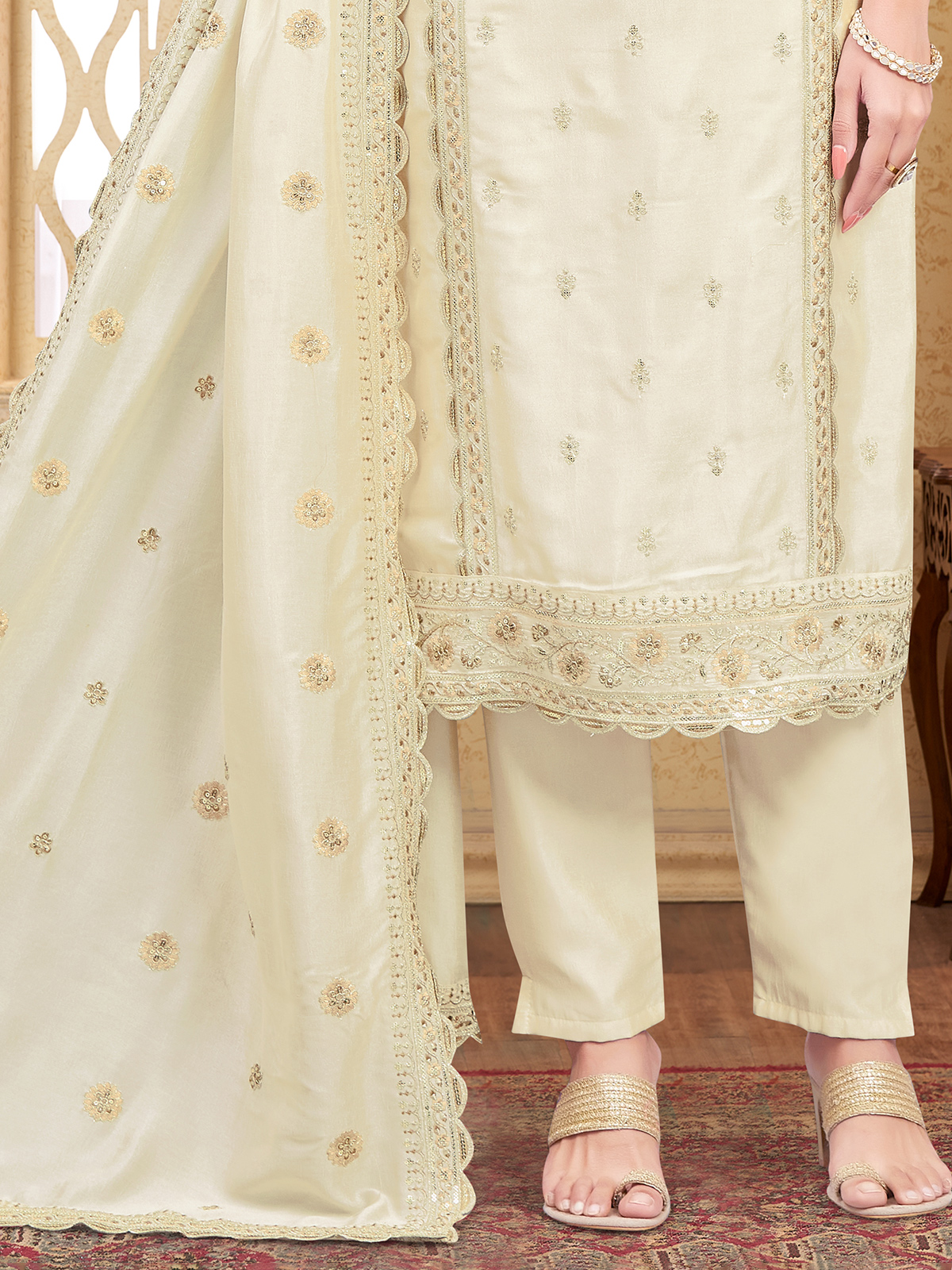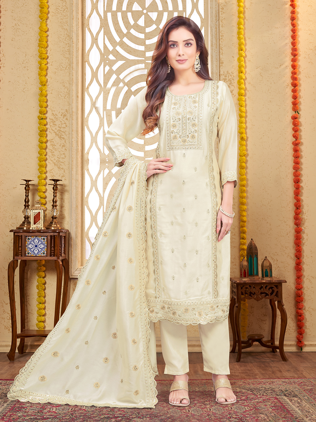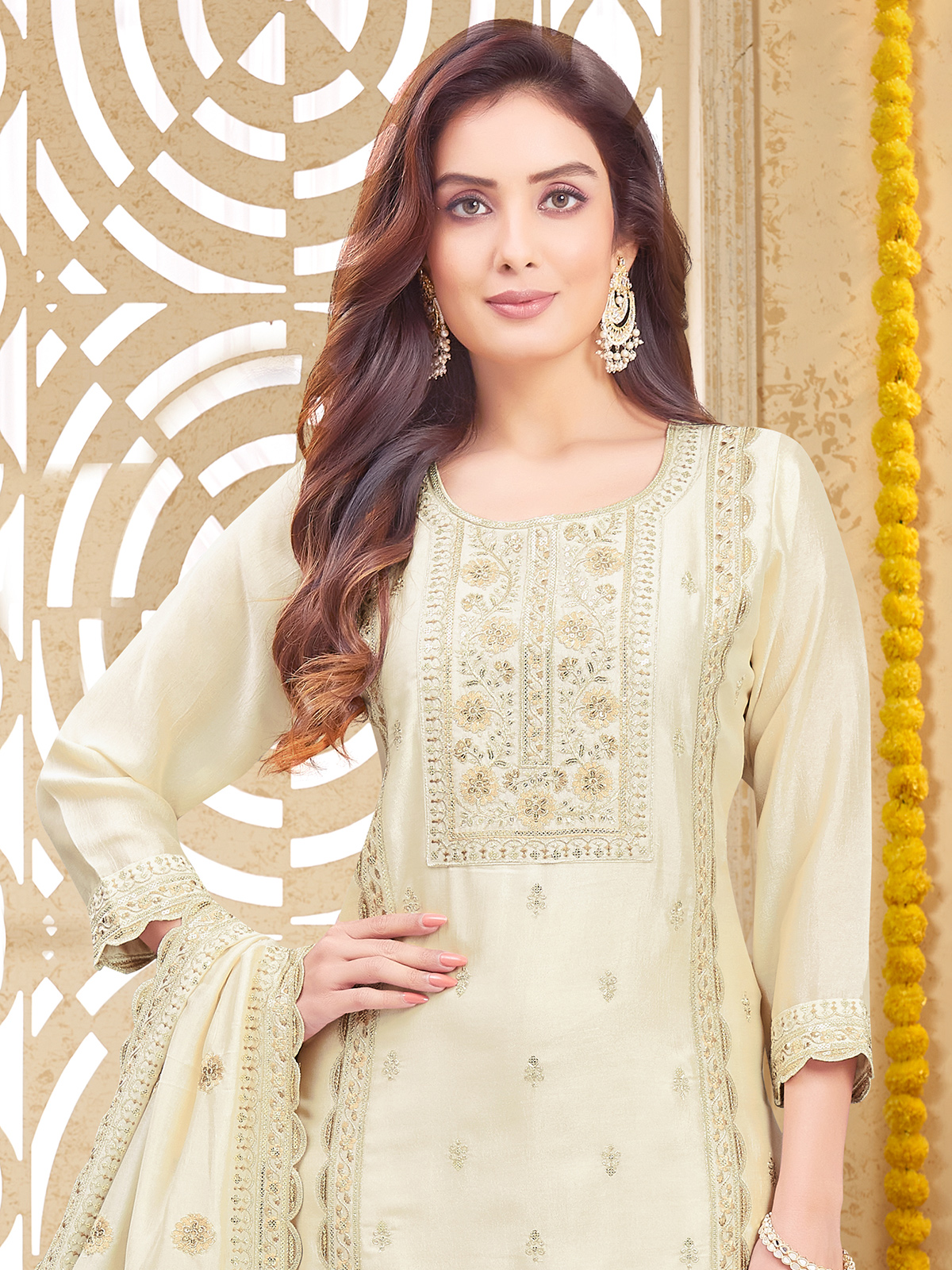 Designed in elegant cream silk straight cut salwar suit is highlighted with delicate embroidery and sequins across a yoke inspired silhouette. Featuring a round neckline and quarter sleeves. It comes paired with a coordinated pant and dupatta, making it ideal for weddings, festive gatherings and sangeet functions.