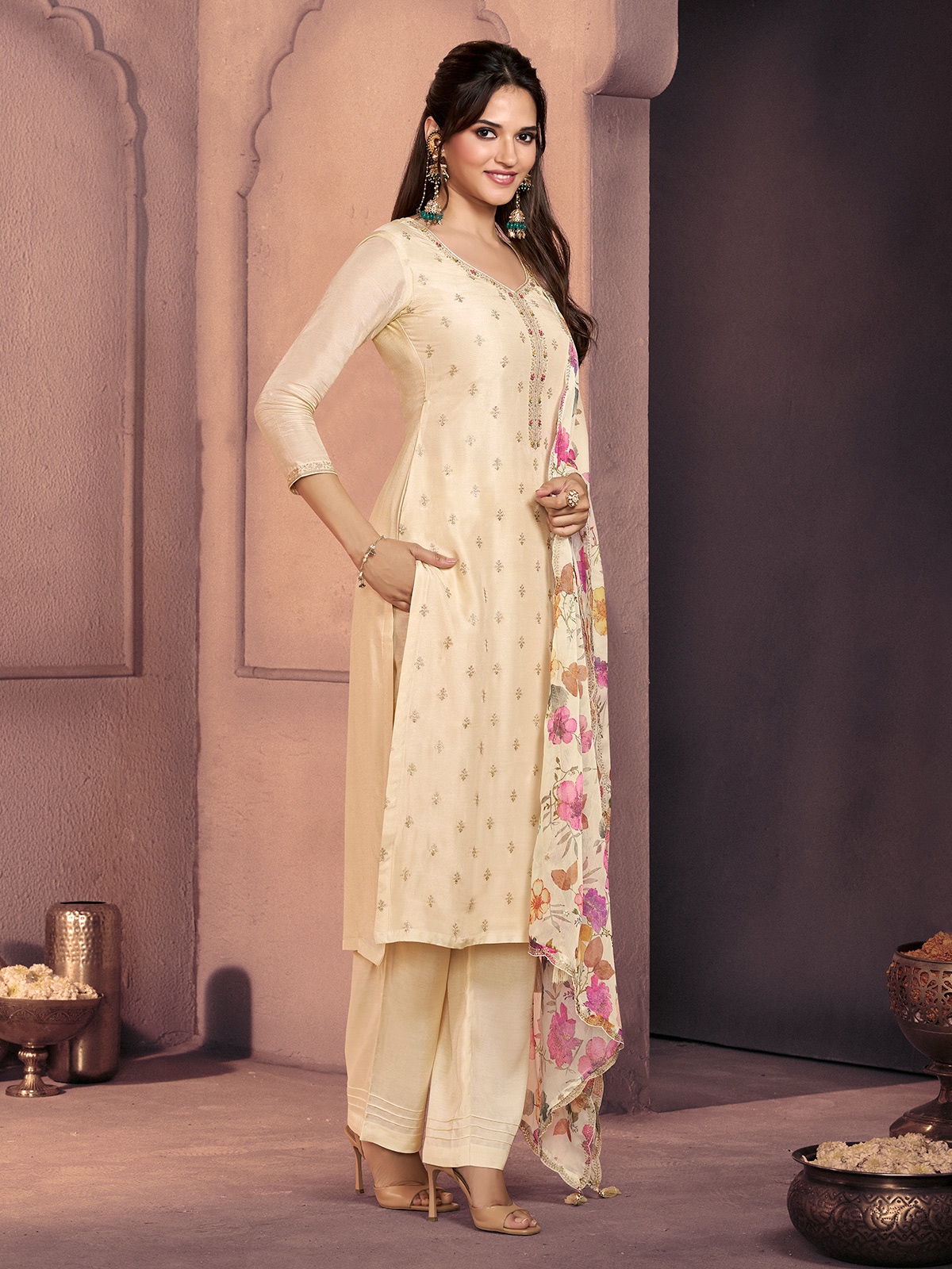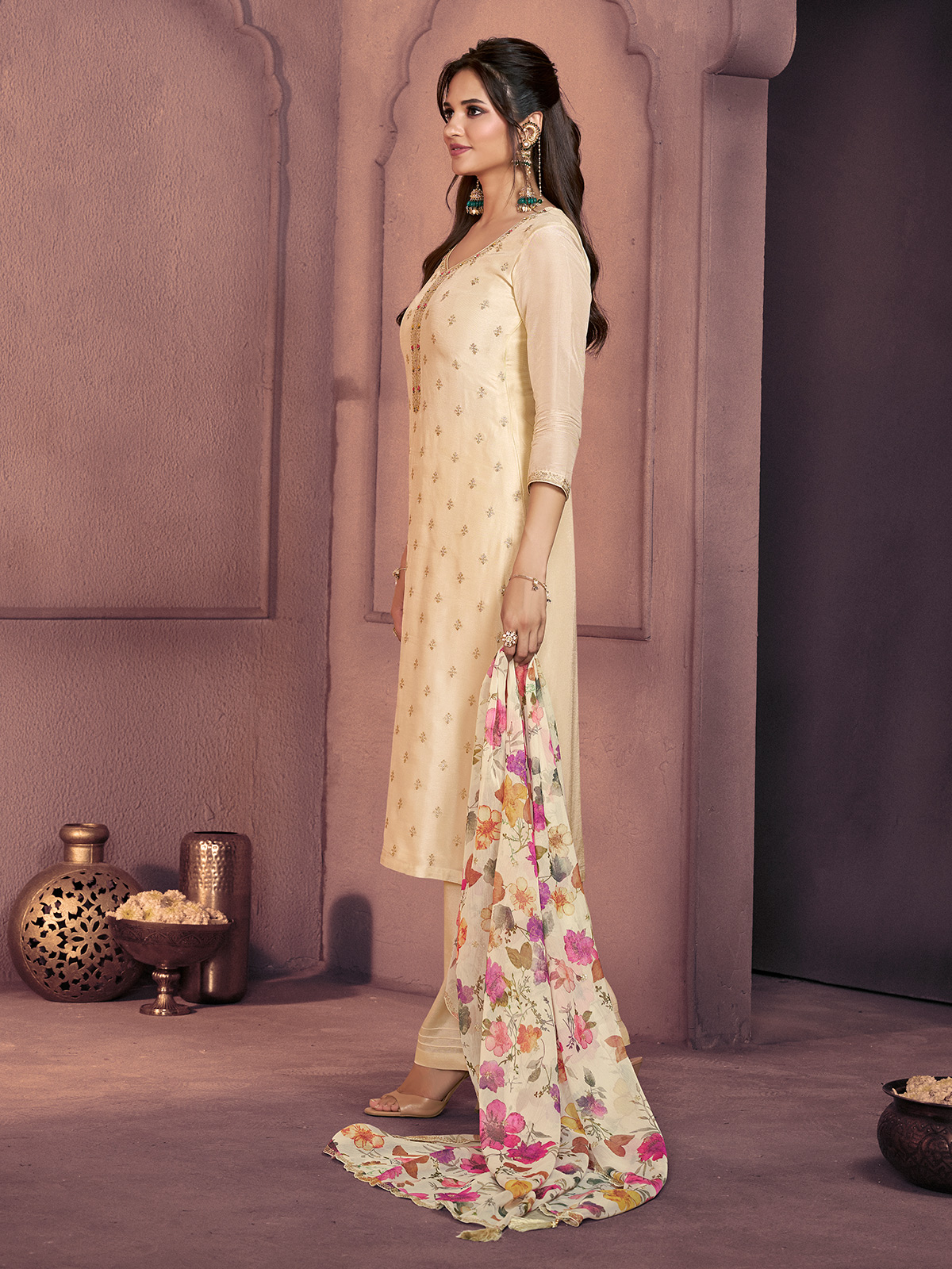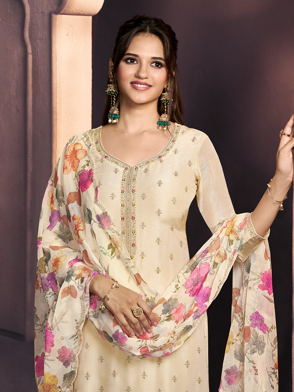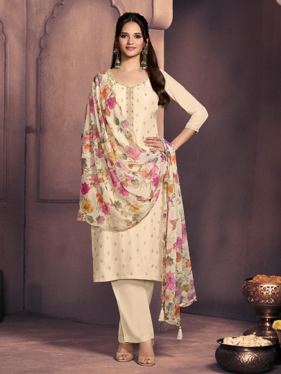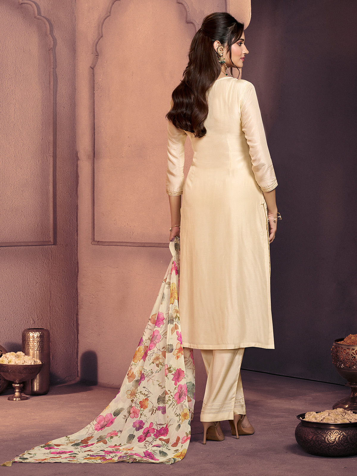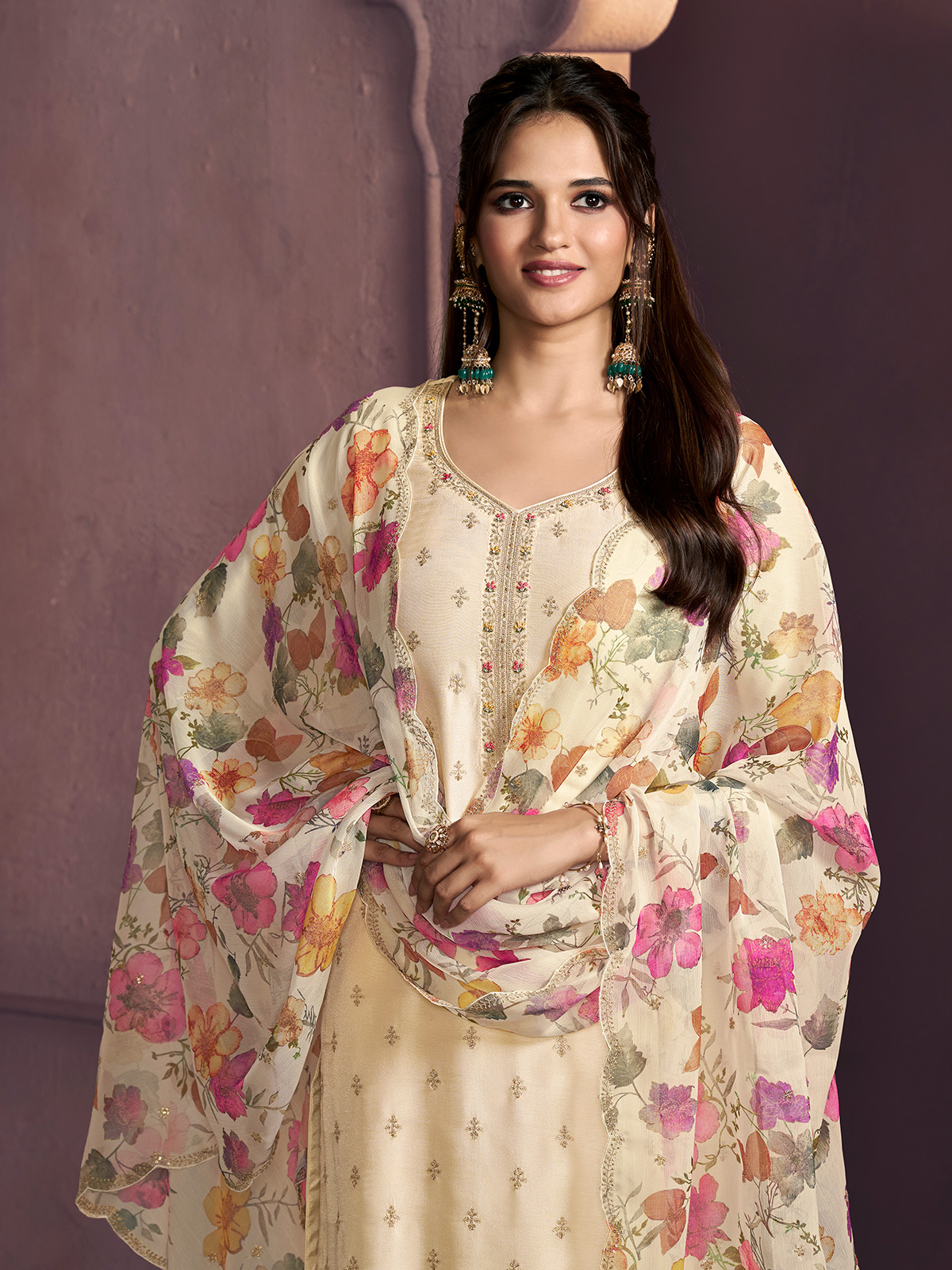 This cream silk design showcases delicate resham threadwork, sequins, and embroidery accents. The kurti is complemented with a vibrant multi-color floral printed dupatta that enhances its festive appeal. Featuring a round neckline and quarter sleeves, it includes comfortable pocket pants, making it suitable for elegant day functions and celebrations.