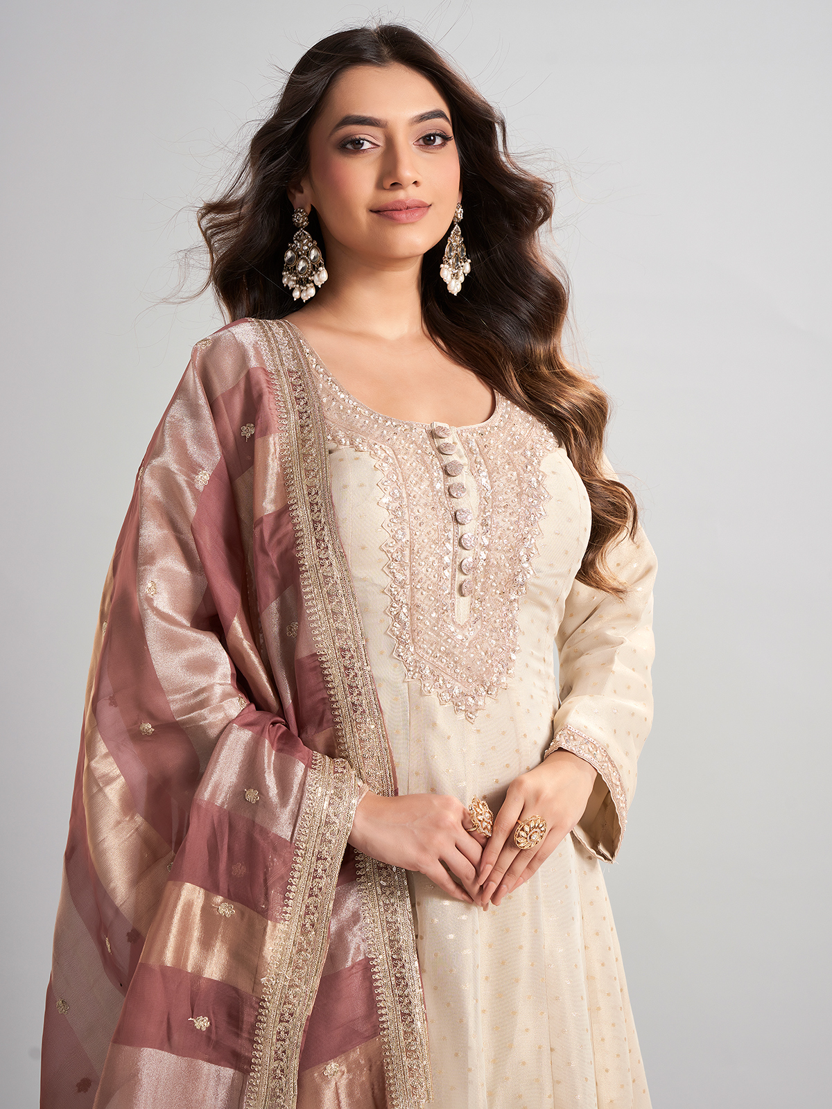 Graceful cream georgette silk palazzo suit styled with full sleeves and round neckline. Embellished with sequins, beads, cutdana, and zari, paired with dupatta. A perfect wedding attire radiating elegance.