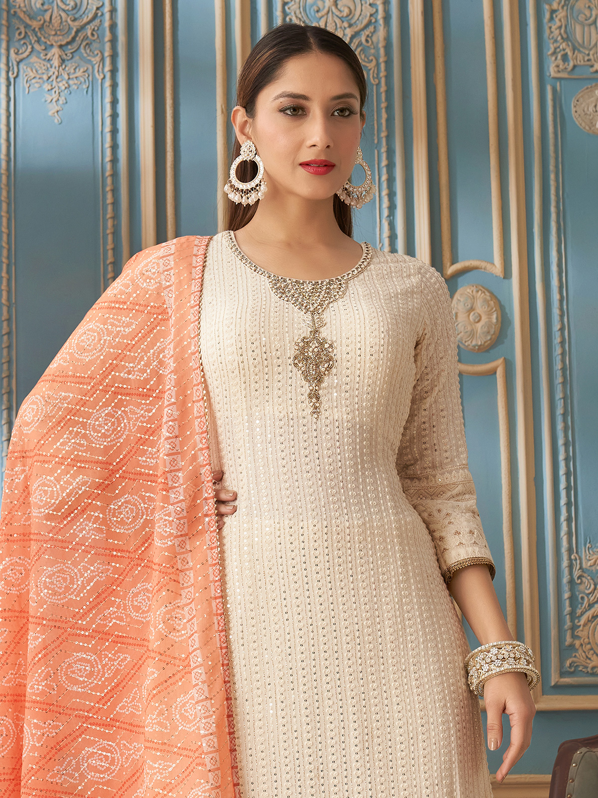 Showcase timeless grandeur with this cream georgette Pakistani-style suit. Embellished with embroidery, sequins, beads, zardosi, and cutdana work, it features a round neckline and quarter sleeves. Paired with dupatta and palazzo, this ensemble is a perfect wedding or sangeet attire, exuding luxury and traditional richness.