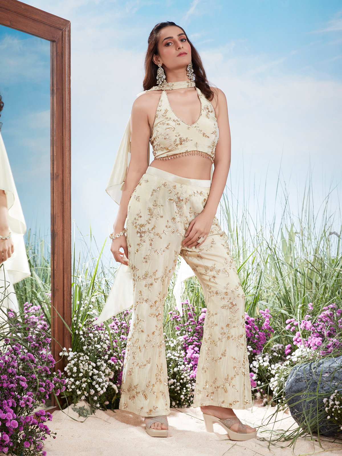 Crafted in cream muslin silk, this Indo-Western outfit features sequin, cut dana, bead, metallic thread, and stone embellishments. Halter-neck design with palazzo bottoms creates a chic silhouette. Ideal for weddings, receptions, sangeet, partywear, and cocktail functions, this ensemble offers contemporary elegance with festive sparkle and intricate craftsmanship.
