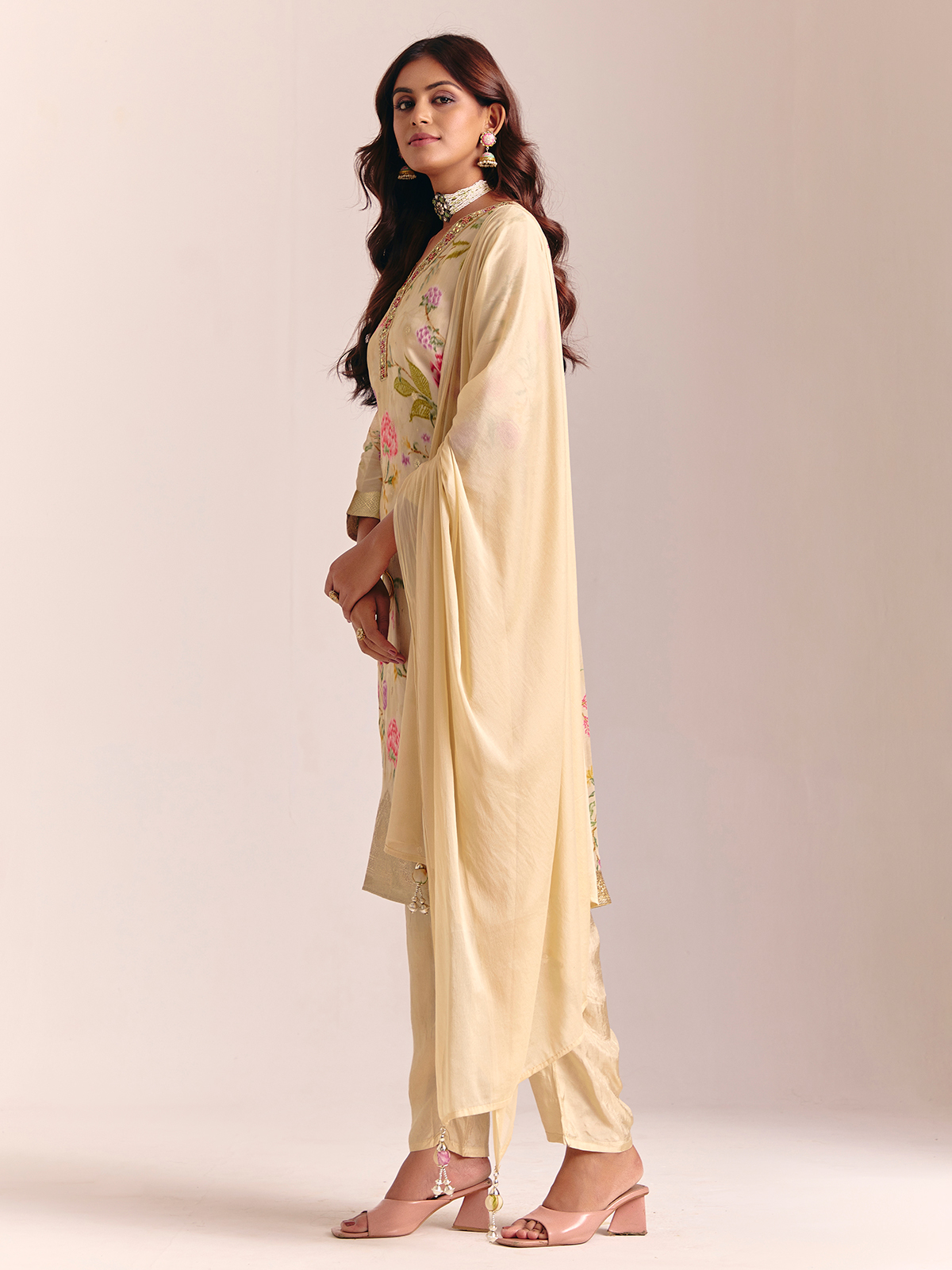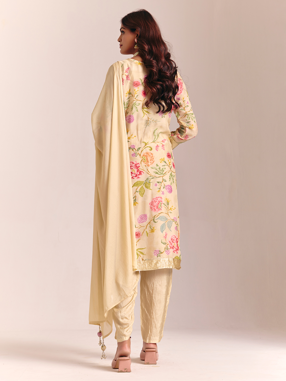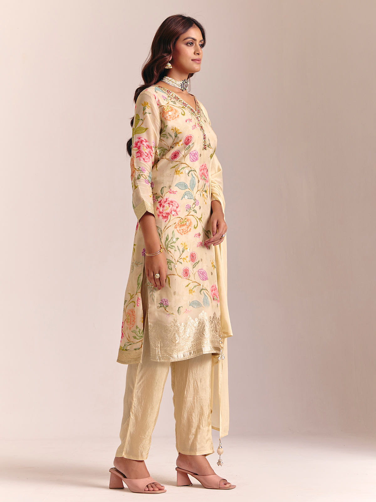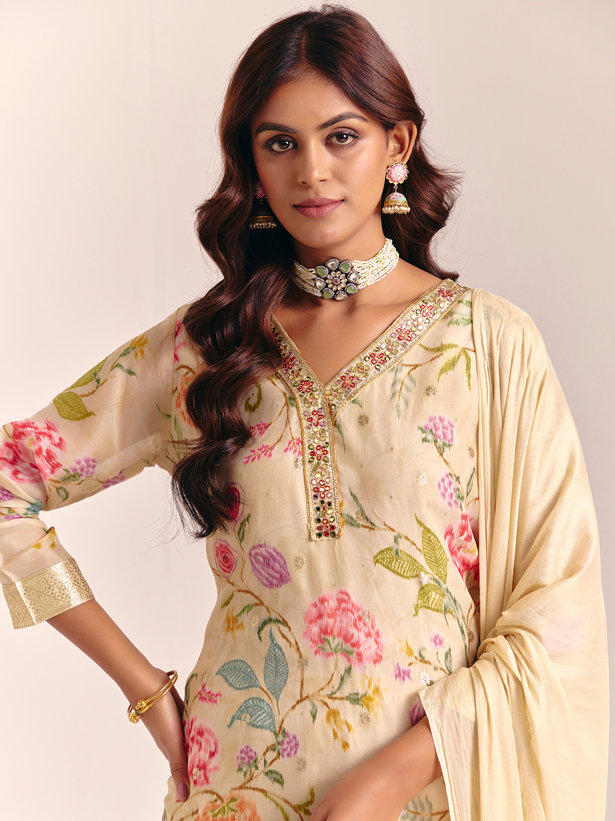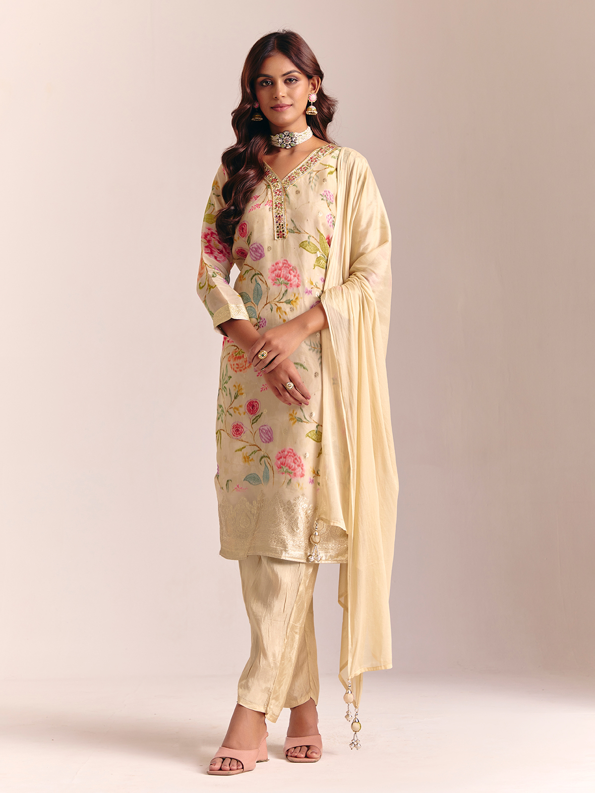 Soft cream printed silk lends refined contemporary radiance to this salwar suit. Mirror, cutdana, stone and zari enrich the V-neckline and quarter sleeves with textured sparkle. Paired with a tailored pant and coordinating dupatta, the ensemble carries polished festive and celebratory charm.