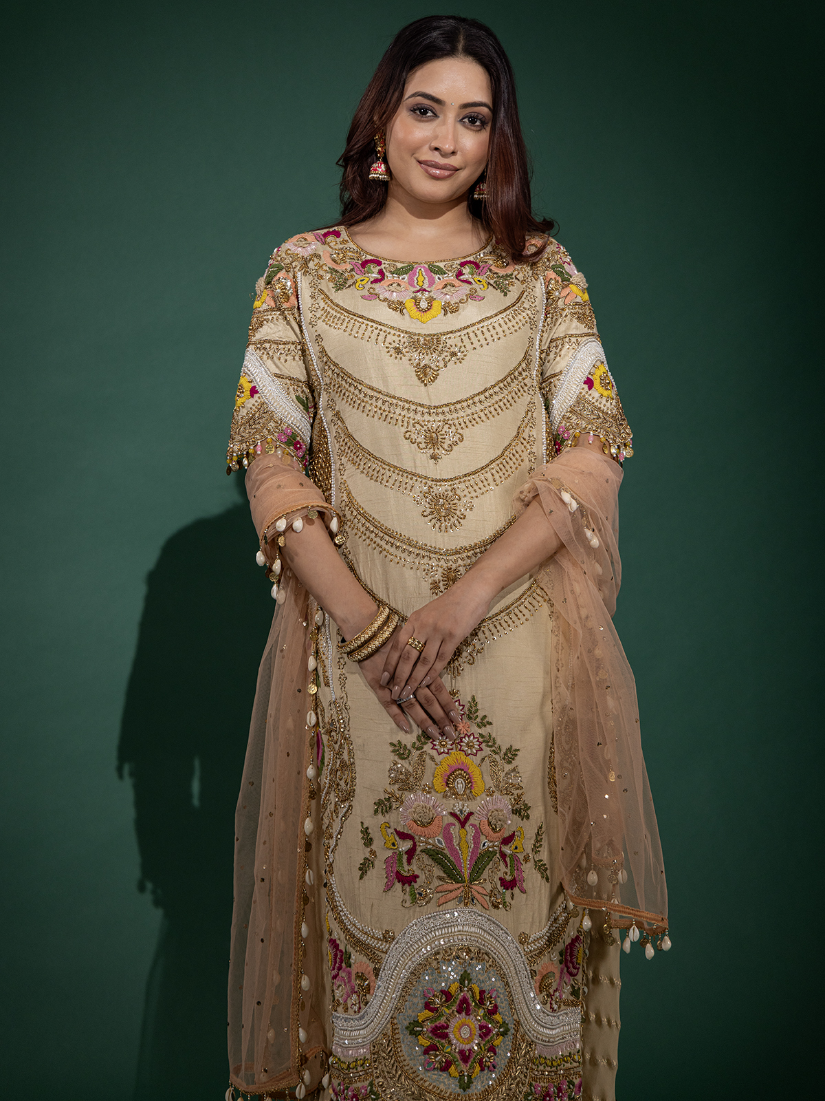 Woven in creamy color in rich raw silk, this palazzo suit shines with beads, sequins, zardosi, thread and pearl embellishments that dance with every glance. The round neckline and elbow sleeves lend refined poise. Teamed with a graceful palazzo and dupatta, it embodies festive charm in every fold.