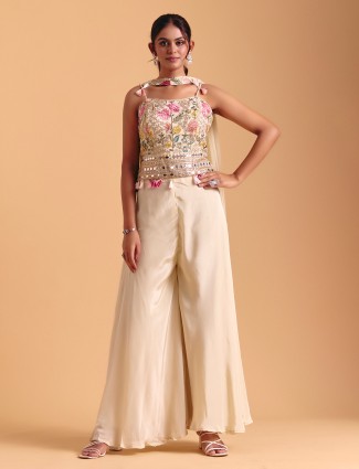 Rich cream satin silk forms this palazzo set with embroidery, aabla and sequins handwork. The sleeveless sweetheart neckline paired with palazzo and dupatta creates refined festive sophistication.
