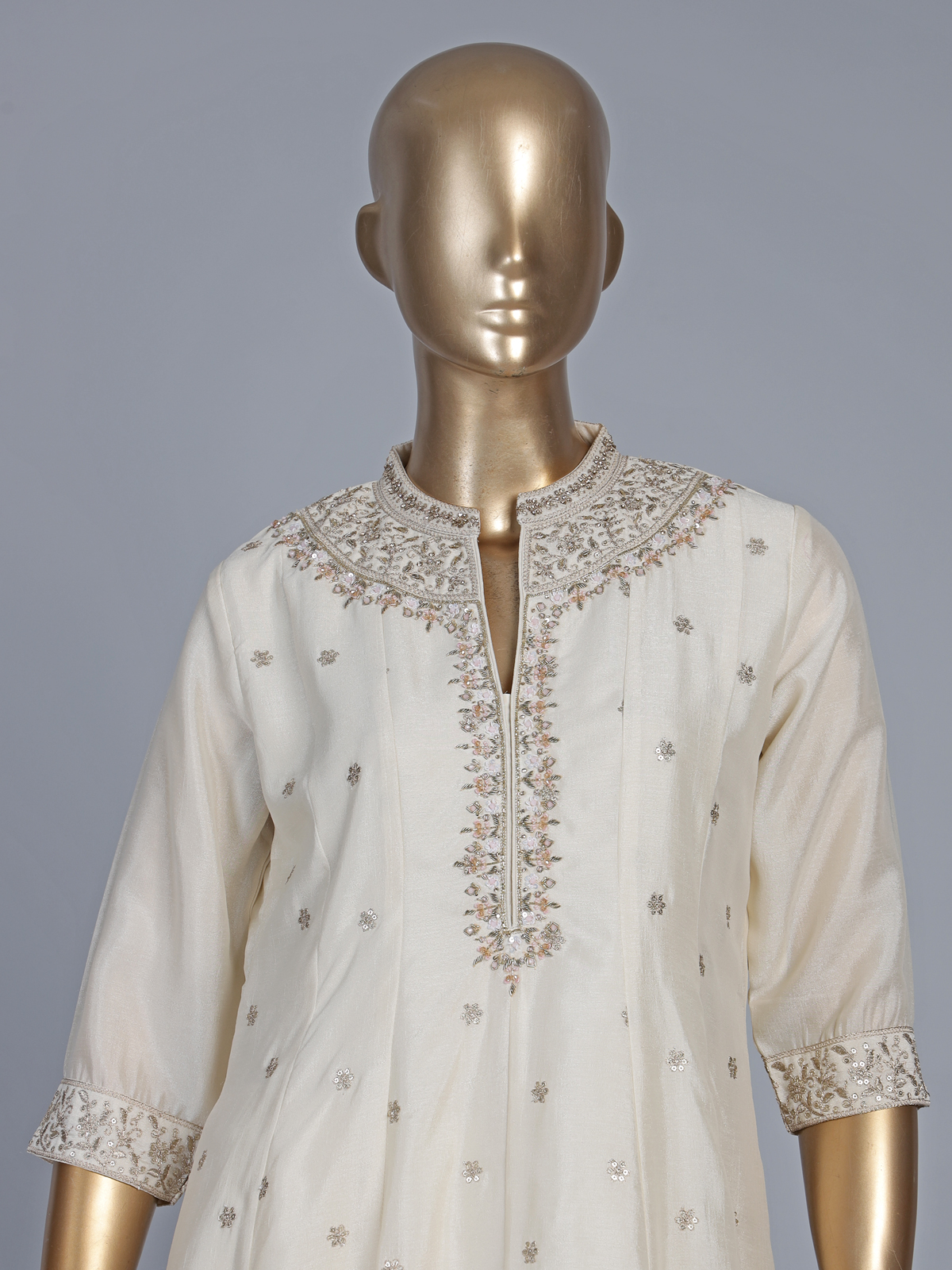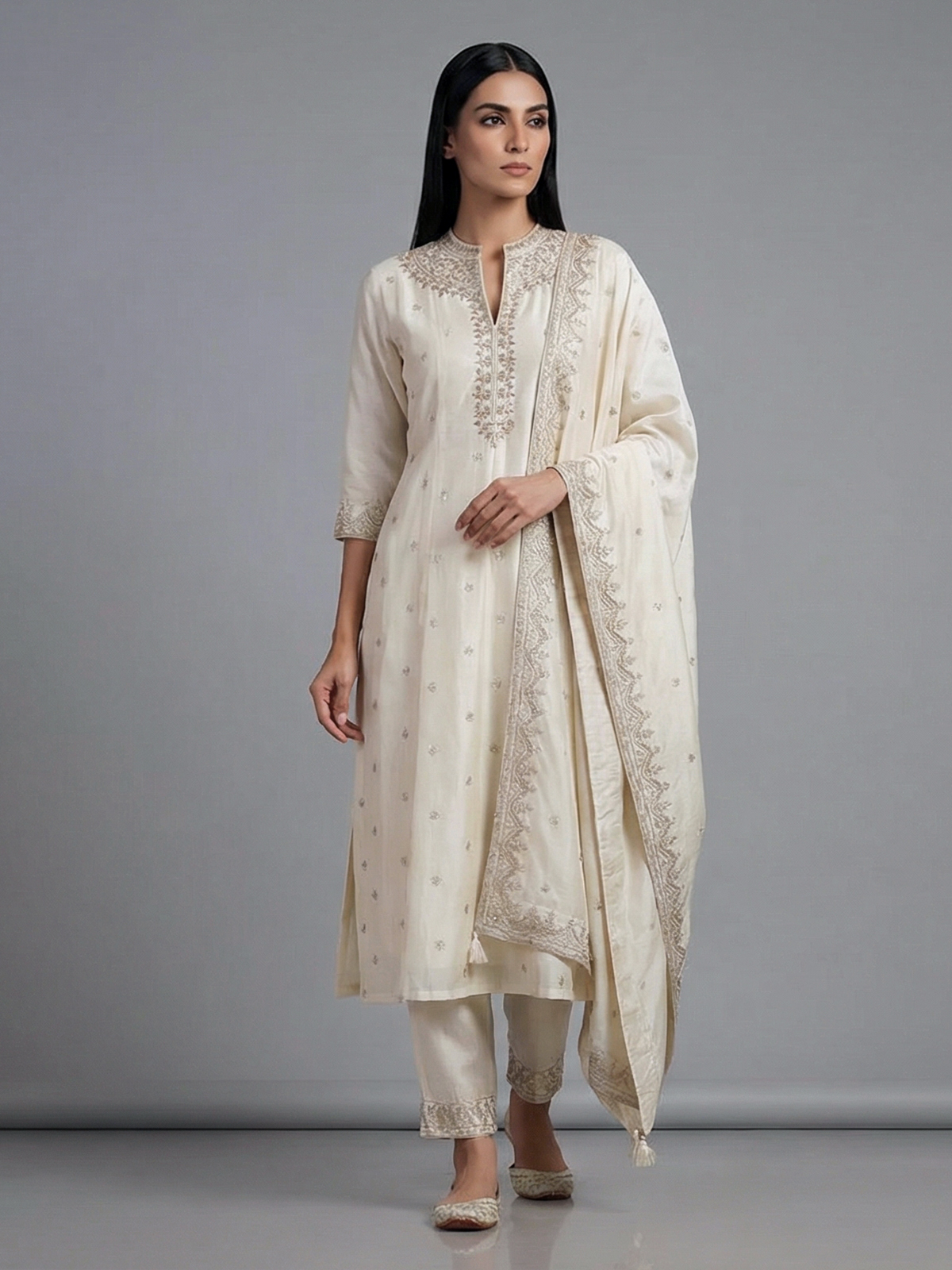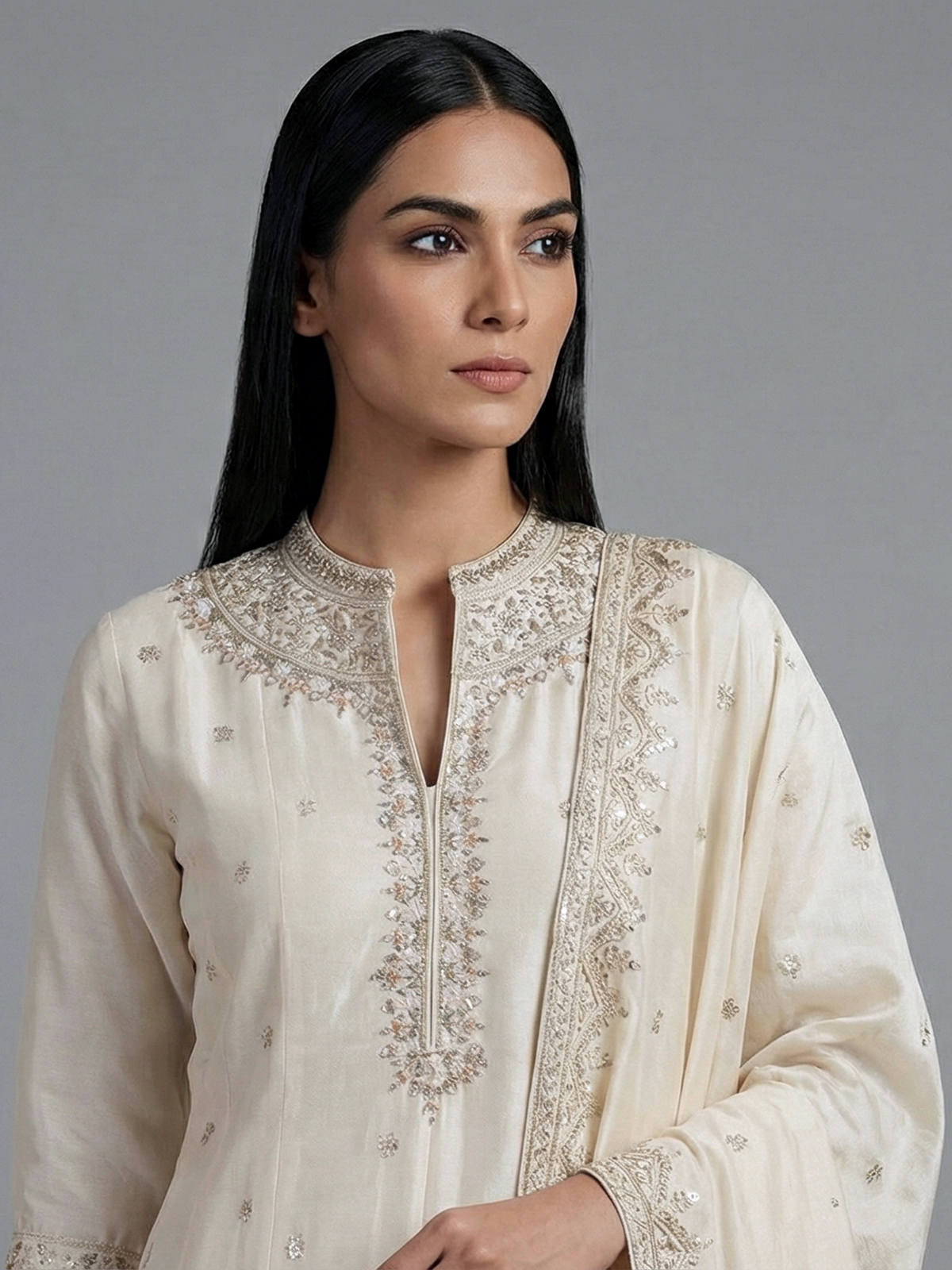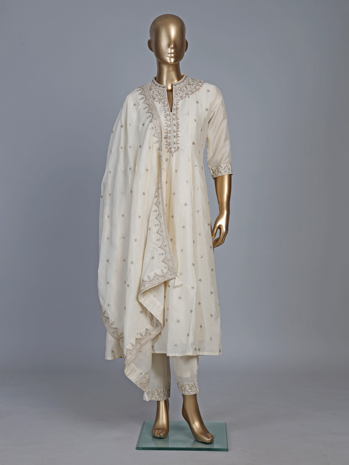 Classic cream silk anarkali suit is a graceful pick for weddings and receptions. The kurti features a stand collar with quarter sleeves. Adorned with resham, sequins, zardosi, cutdana and bead work. Paired with pants and a dupatta, it creates a flowing and elegant silhouette. The rich silk fabric enhances its regal charm. Offering a timeless blend of tradition and modern sophistication.