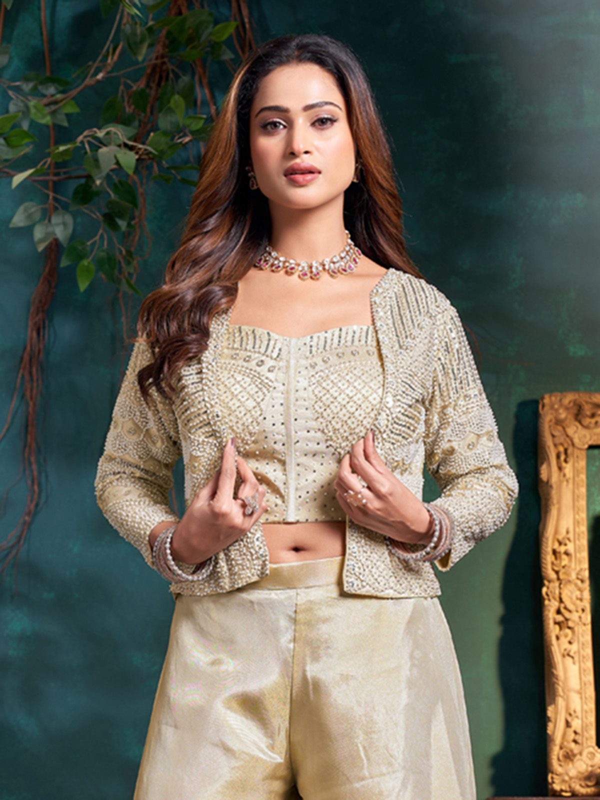 Graceful sophistication defines this cream silk designer palazzo suit crafted for festive grandeur. The elegant jacket style kurta is adorned with intricate cutdana, beads and sequins that shimmer delicately with movement. Paired with flowing palazzo bottoms, the ensemble creates a regal layered silhouette perfect for weddings, receptions and lively sangeet celebrations where refined ethnic style shines effortlessly.