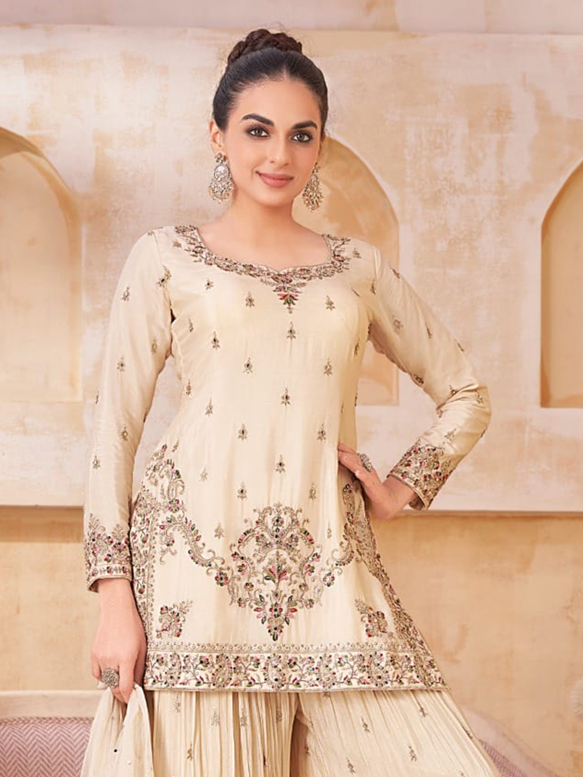 Crafted in luxurious cream silk elegant palazzo suit is adorned with intricate embroidery highlighted by resham and sequin detailing. Designed with a graceful sweetheart neckline and full sleeves, it is paired with a flowing palazzo, making it perfect for weddings and festive celebrations.