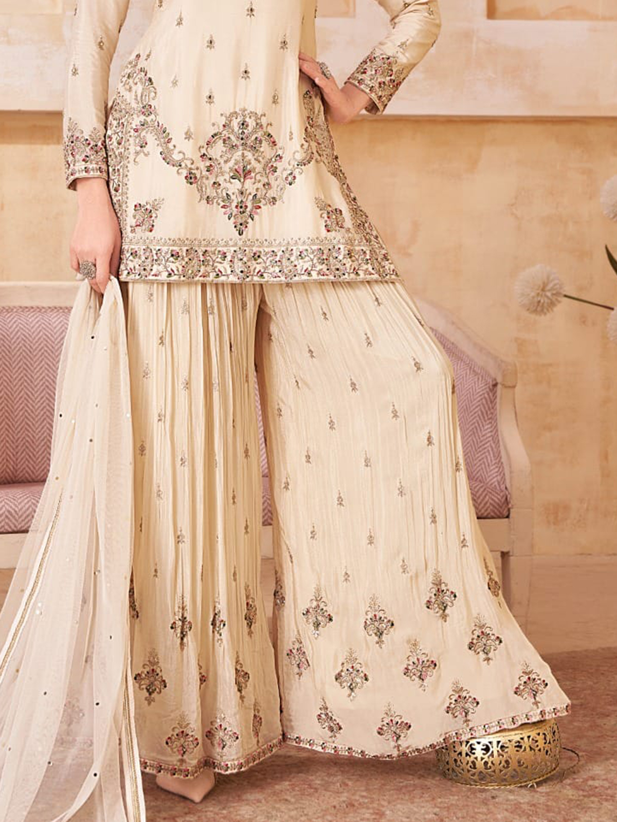 Cream Silk Embroidered Palazzo Suit