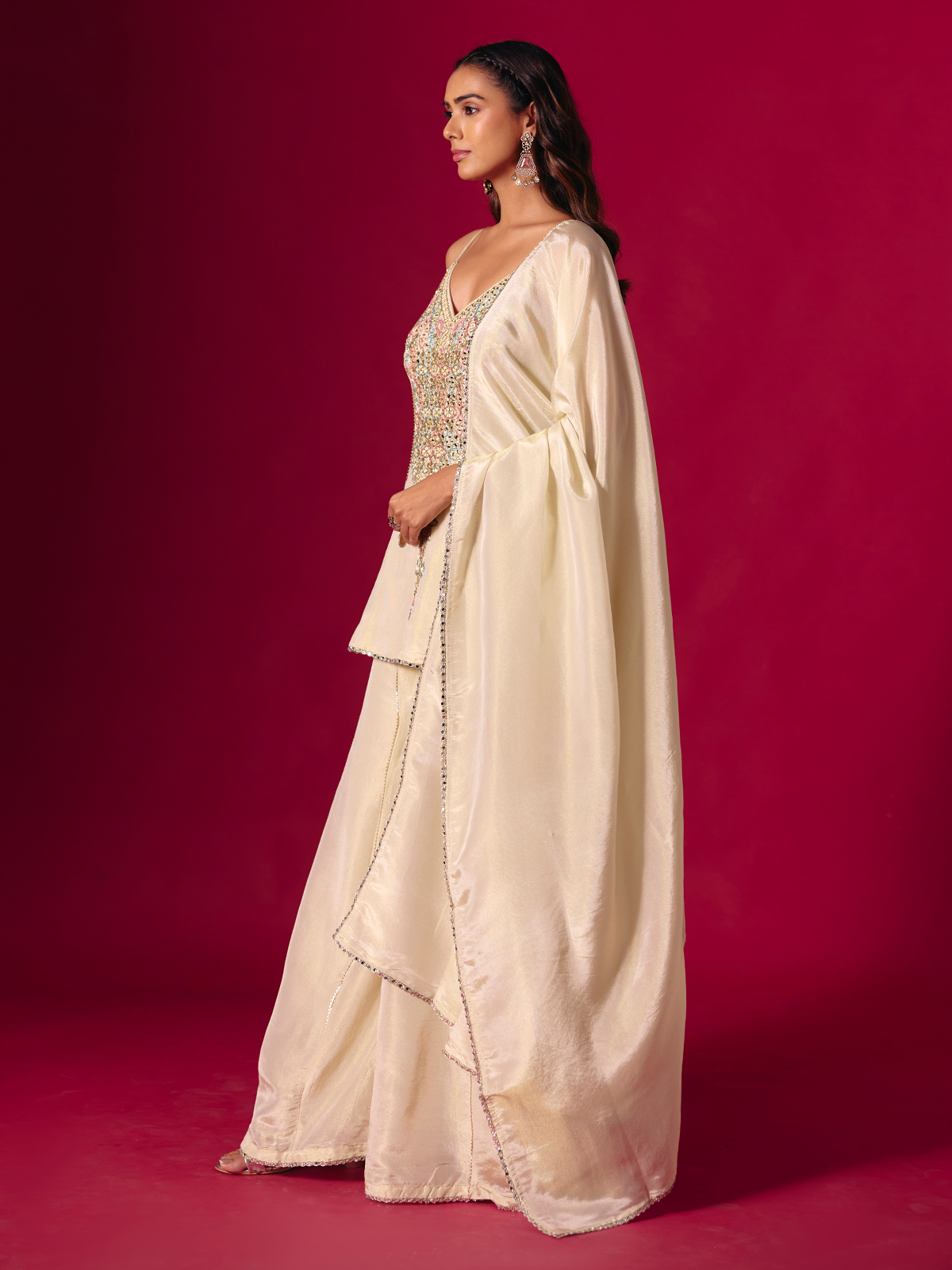 Cream Silk Mirror Embroidered Festive Palazzo Suit