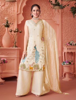 Cream Silk Palazzo Suit With Artistic Embellished Richness