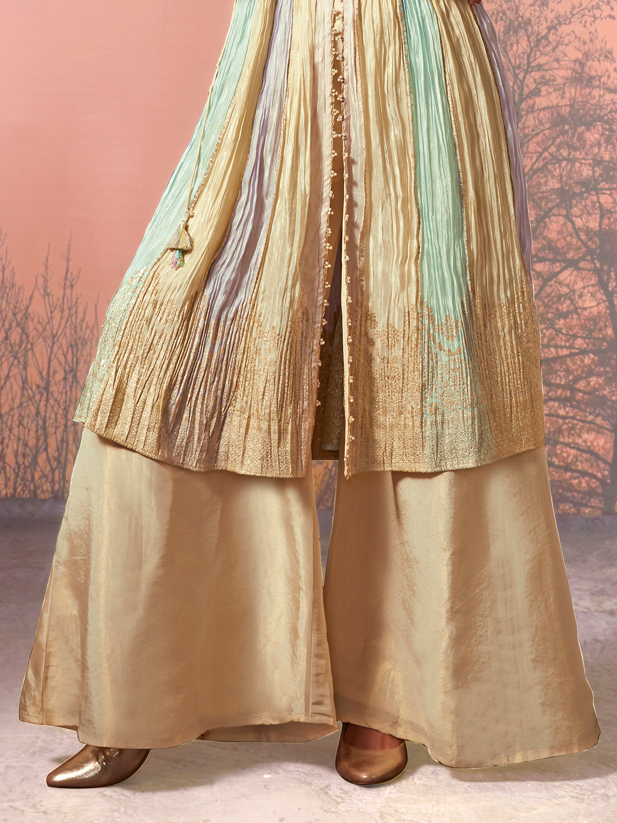 Cream Silk Pearl Embellished Festive Palazzo Suit