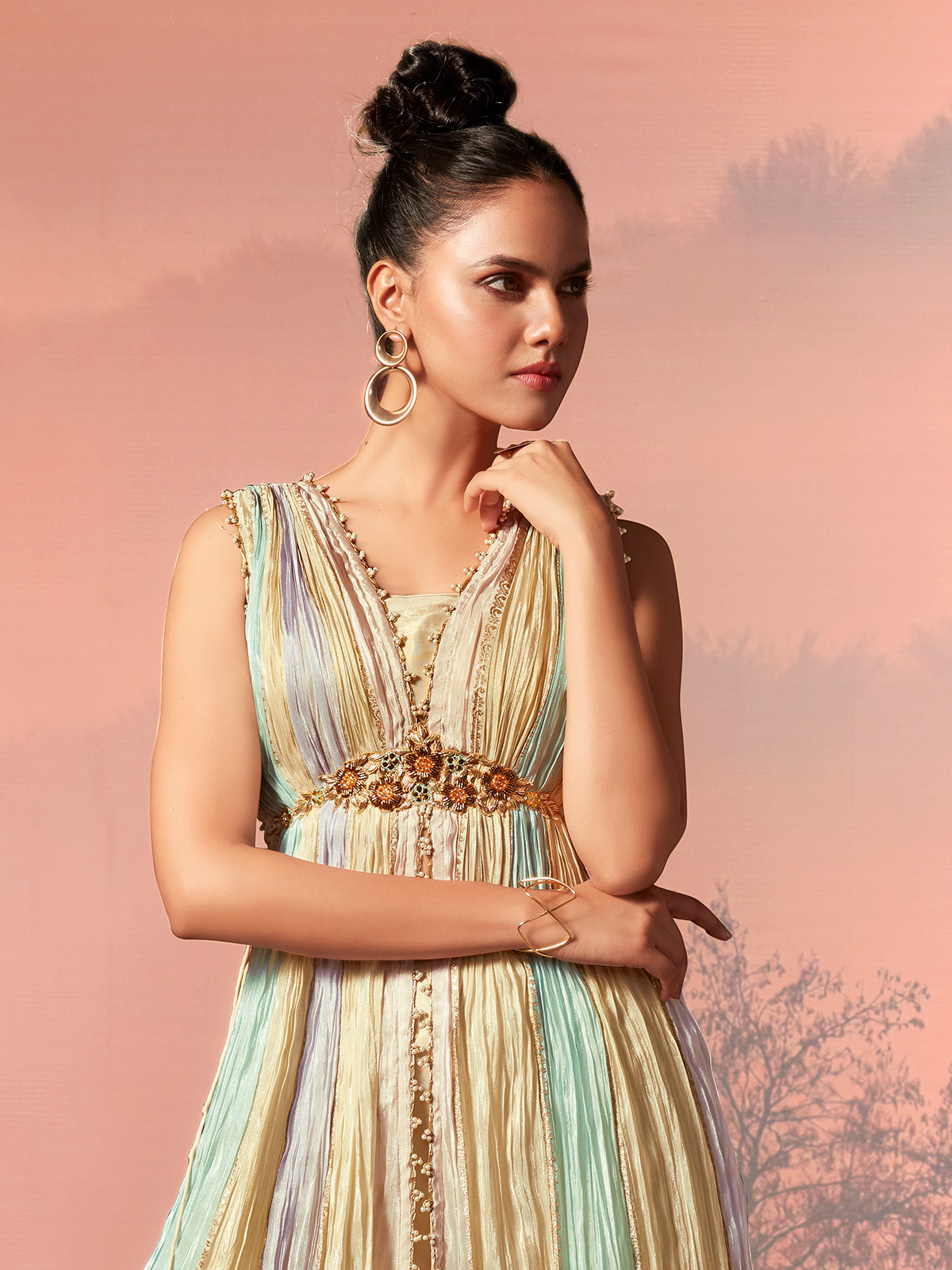 This cream silk palazzo suit is adorned with pearls, zardosi, mirror, cutdana and zari detailing for refined elegance. The sleeveless silhouette and flowing palazzo offer a graceful drape, making it a timeless choice for weddings, festive celebrations and sophisticated reception occasions.