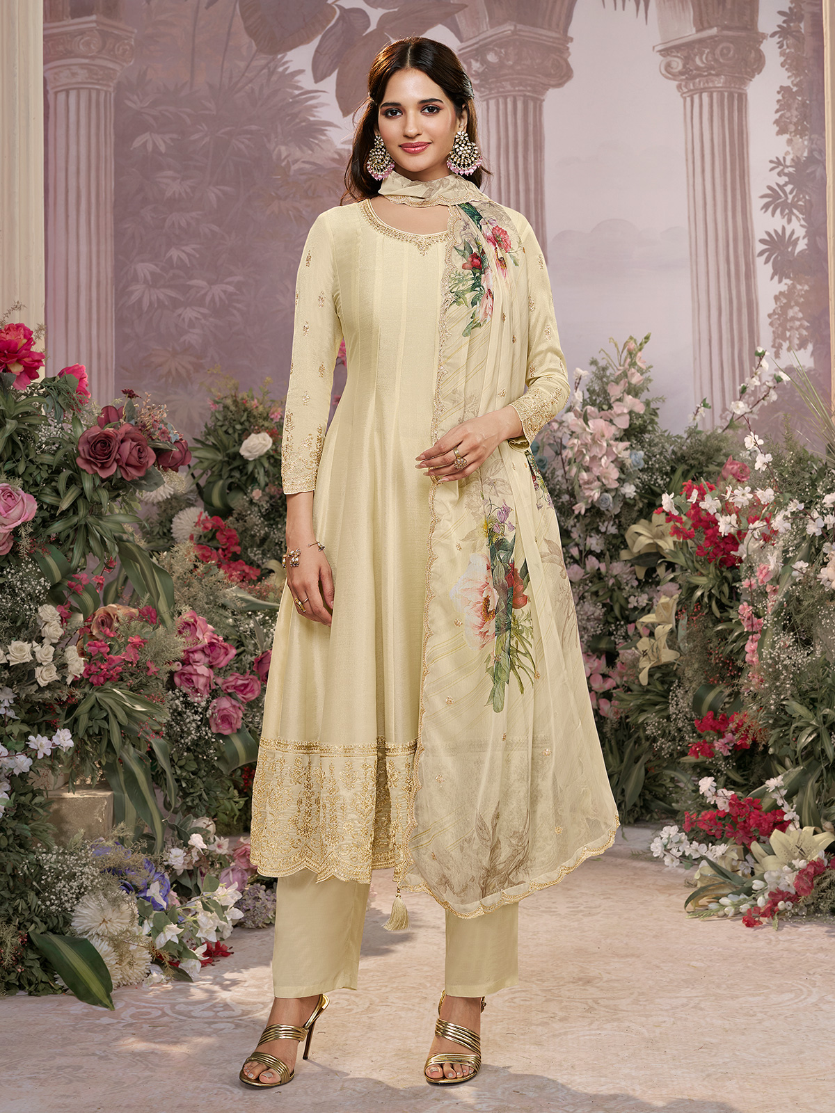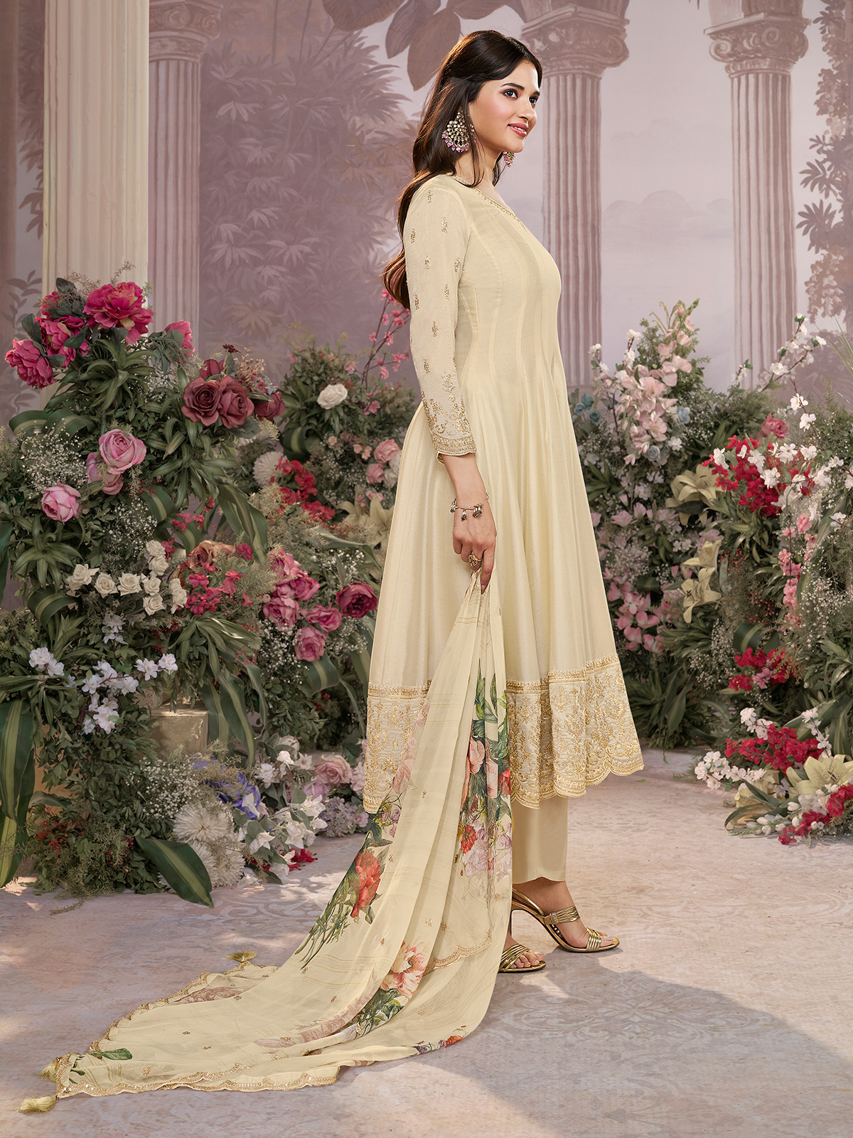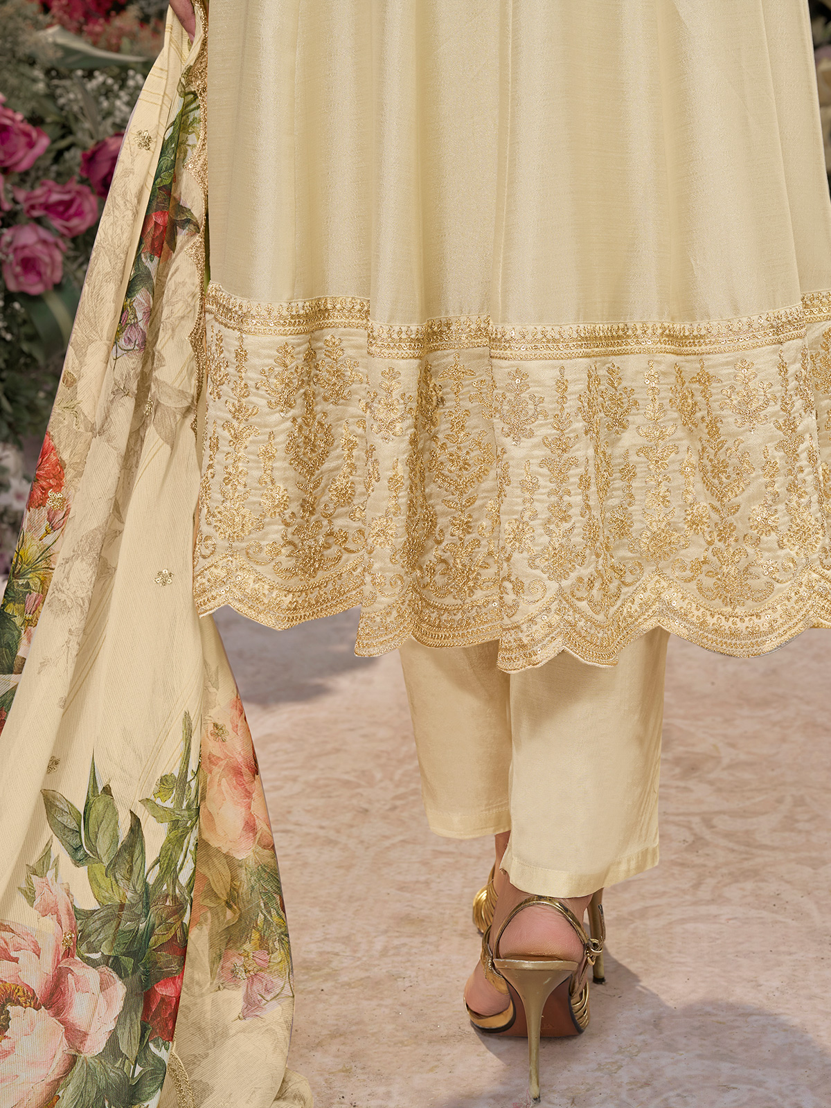 Cream Silk Salwar Suit With Coordinated Printed Dupatta