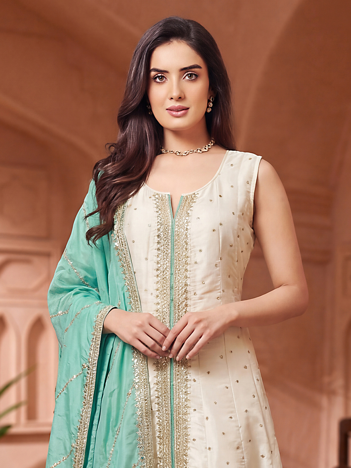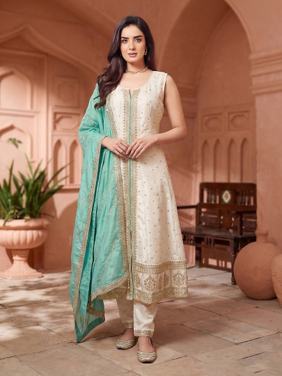 Designed in elegant cream silk anarkali suit. Features resham and sequin detailing for rich festive appeal. Styled sleeveless with a round neckline, it is paired with pants and a contrast dupatta, ideal for weddings, sangeet and celebrations.