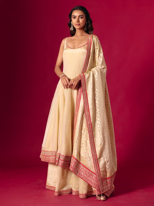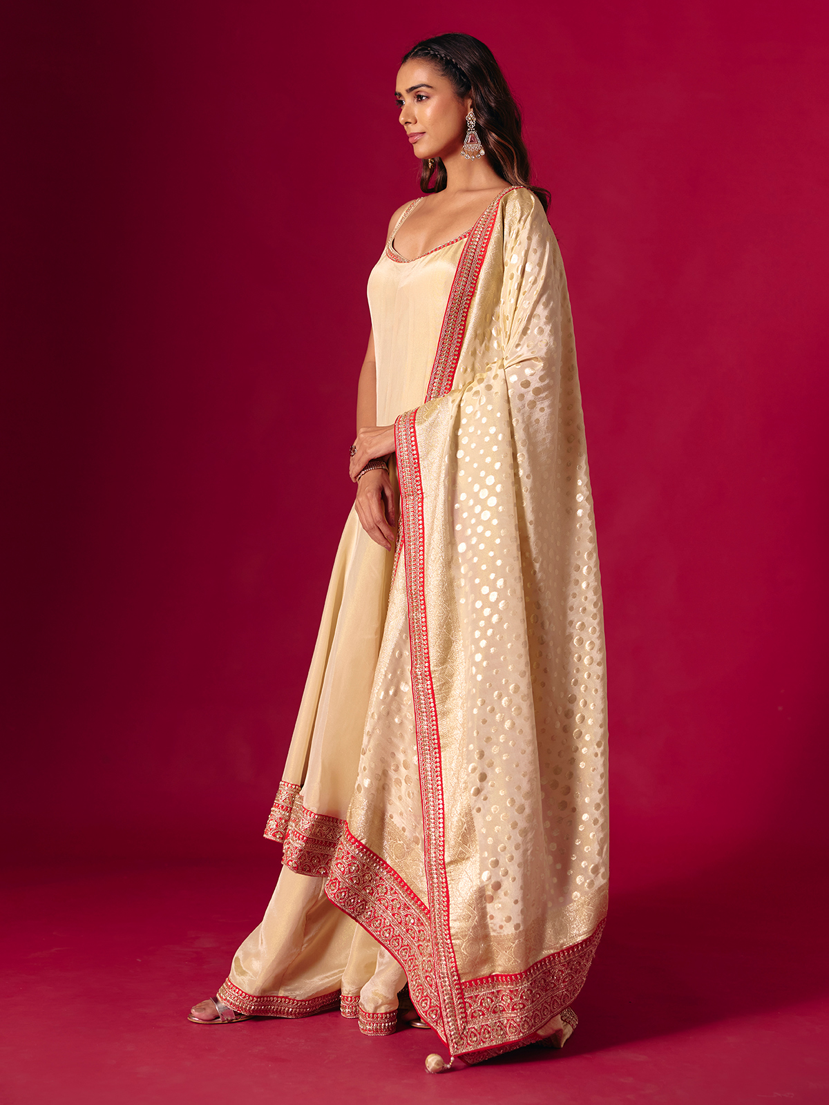 This elegant cream silk palazzo suit features delicate zari, sequins, and cutdana embroidery. Its sleeveless cut and round neckline lend an effortless charm—ideal for weddings or festive gatherings where grace takes the spotlight in every subtle shimmer.