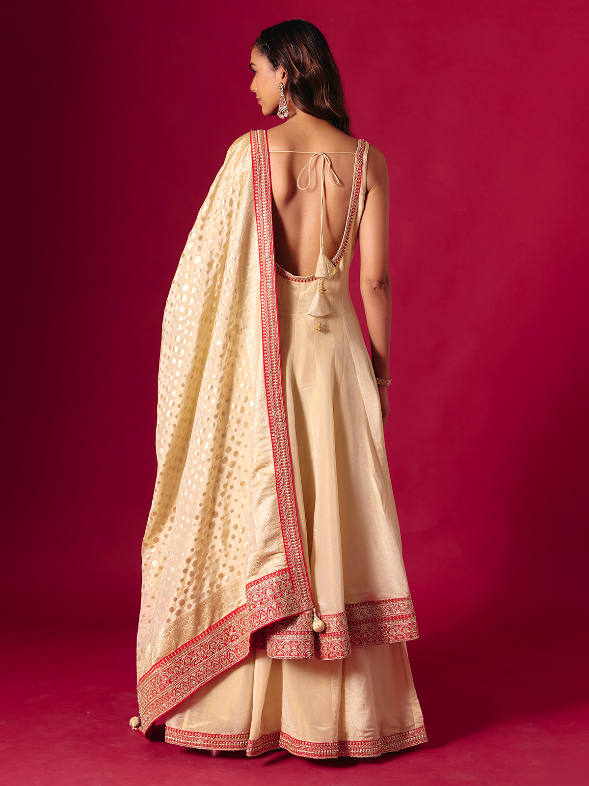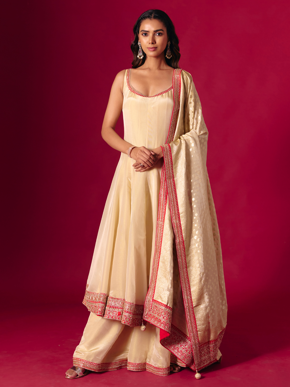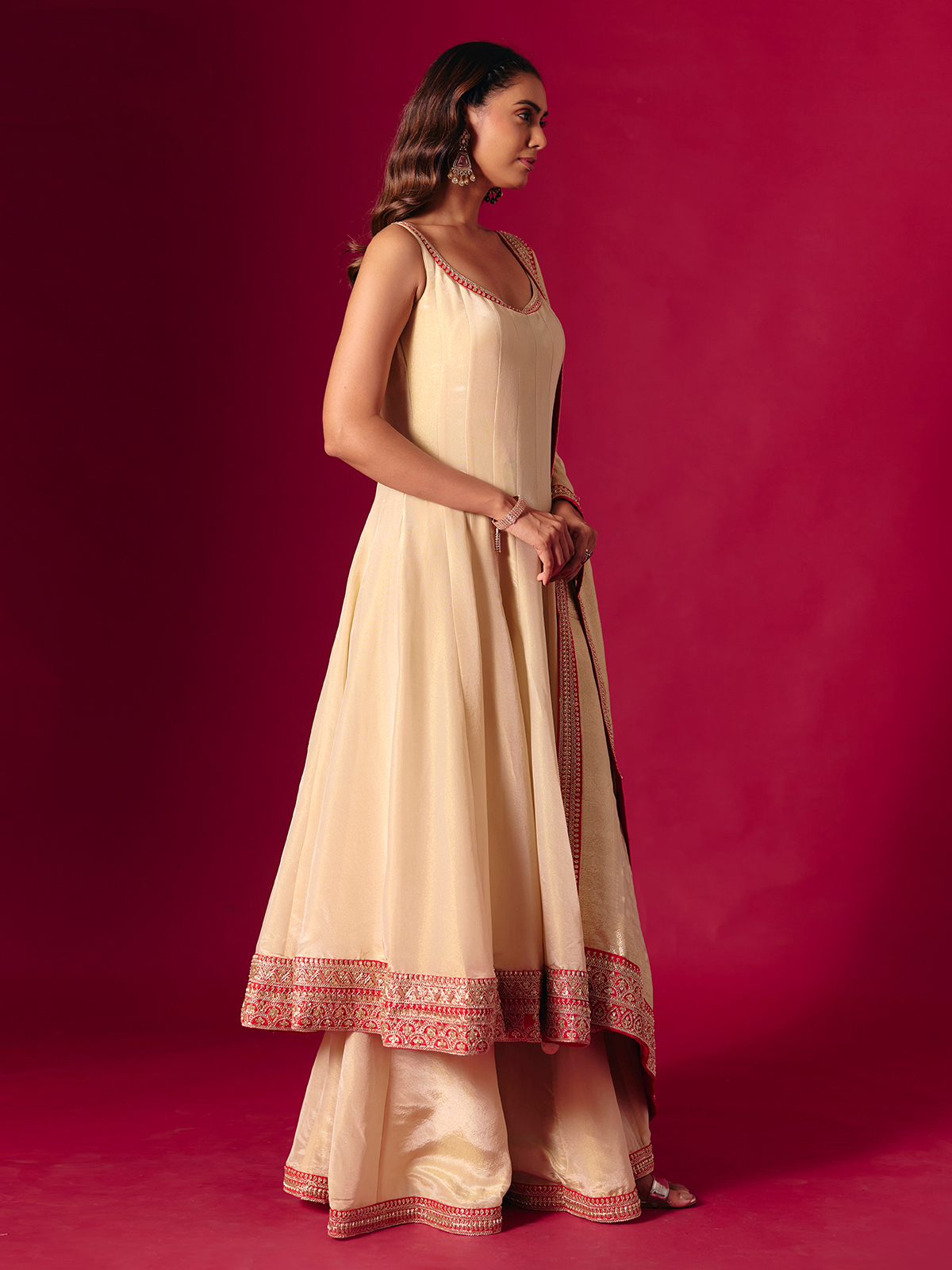 Cream Silk Sleeveless Zari Embroidered Palazzo Suit