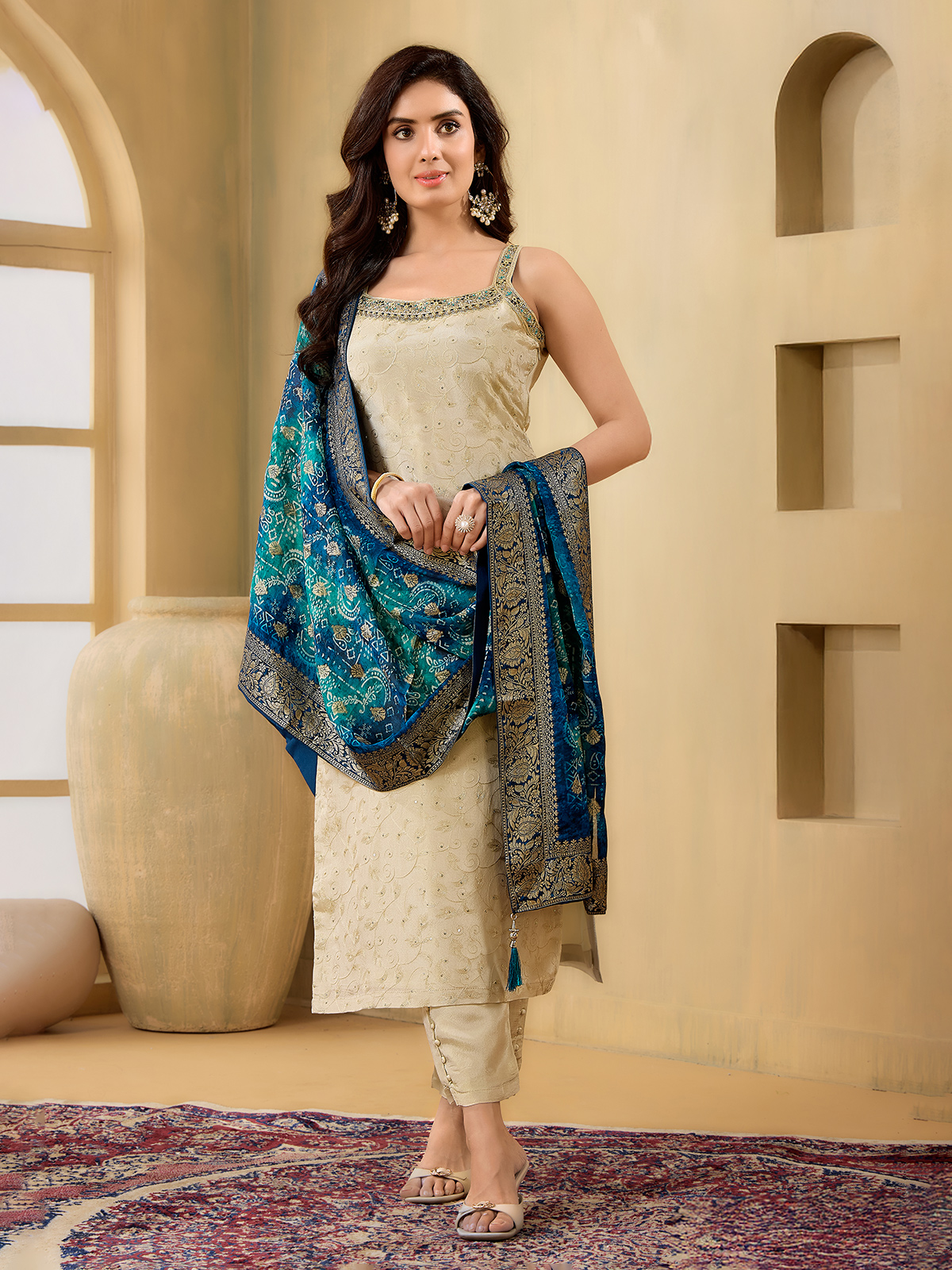 Elegant cream silk salwar suit with featuring embroidery, sequins, thread, cutdana and zardosi work. Designed in a straight cut with a square neckline and sleeveless style, it is paired with a contrast dupatta and pant for festive sophistication.