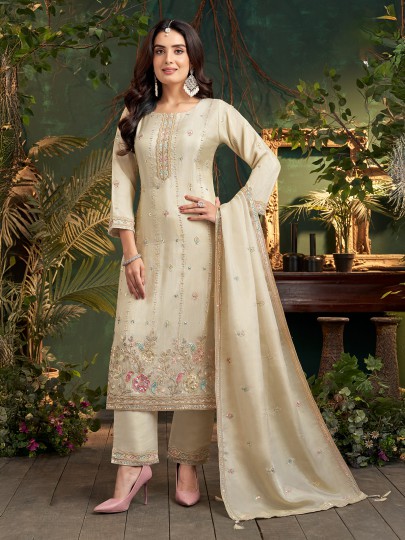 Elegant cream silk salwar suit. Enhanced with embroidery, sequins and cutdana work. Styled in a straight cut with a round neckline and quarter sleeves, it is paired with a pant and dupatta, suitable for weddings and festive gatherings.