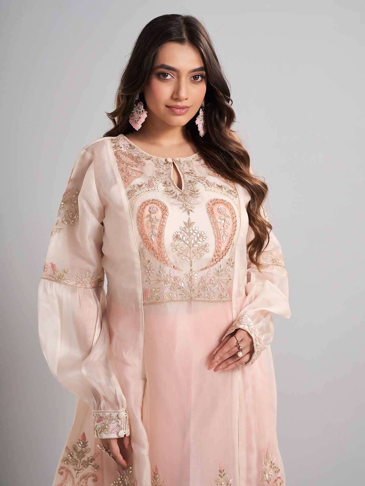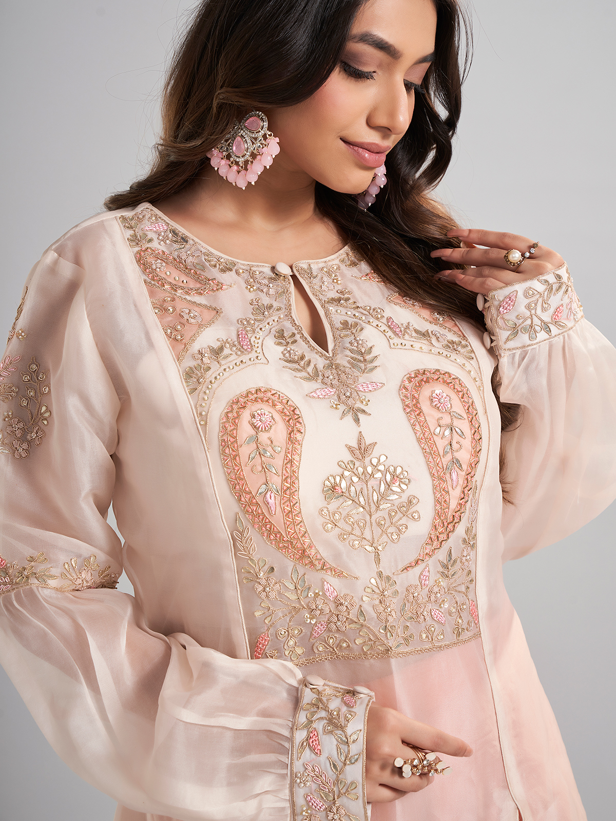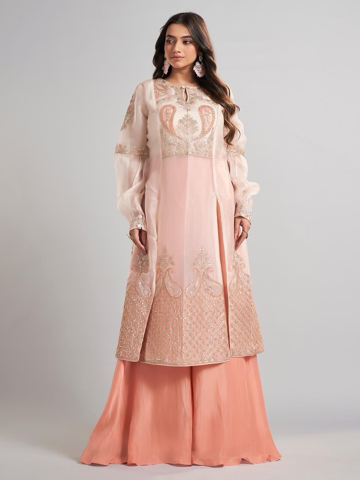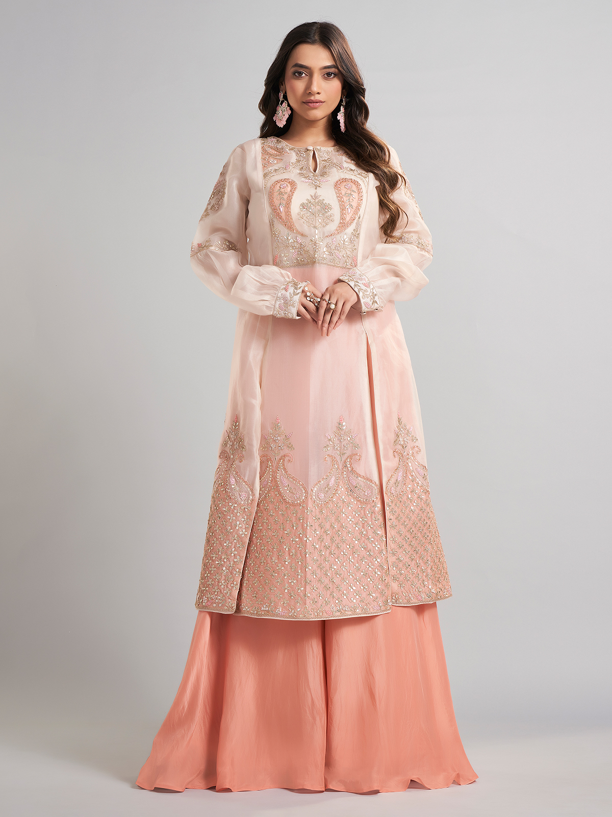 This cream Pakistani palazzo suit in tissue and satin silk highlights a keyhole neckline and full sleeves. Adorned with cutdana, sequins, beads, zardosi, resham, thread, and gota, it’s a perfect outfit for weddings and festive celebrations, glowing with sophistication.