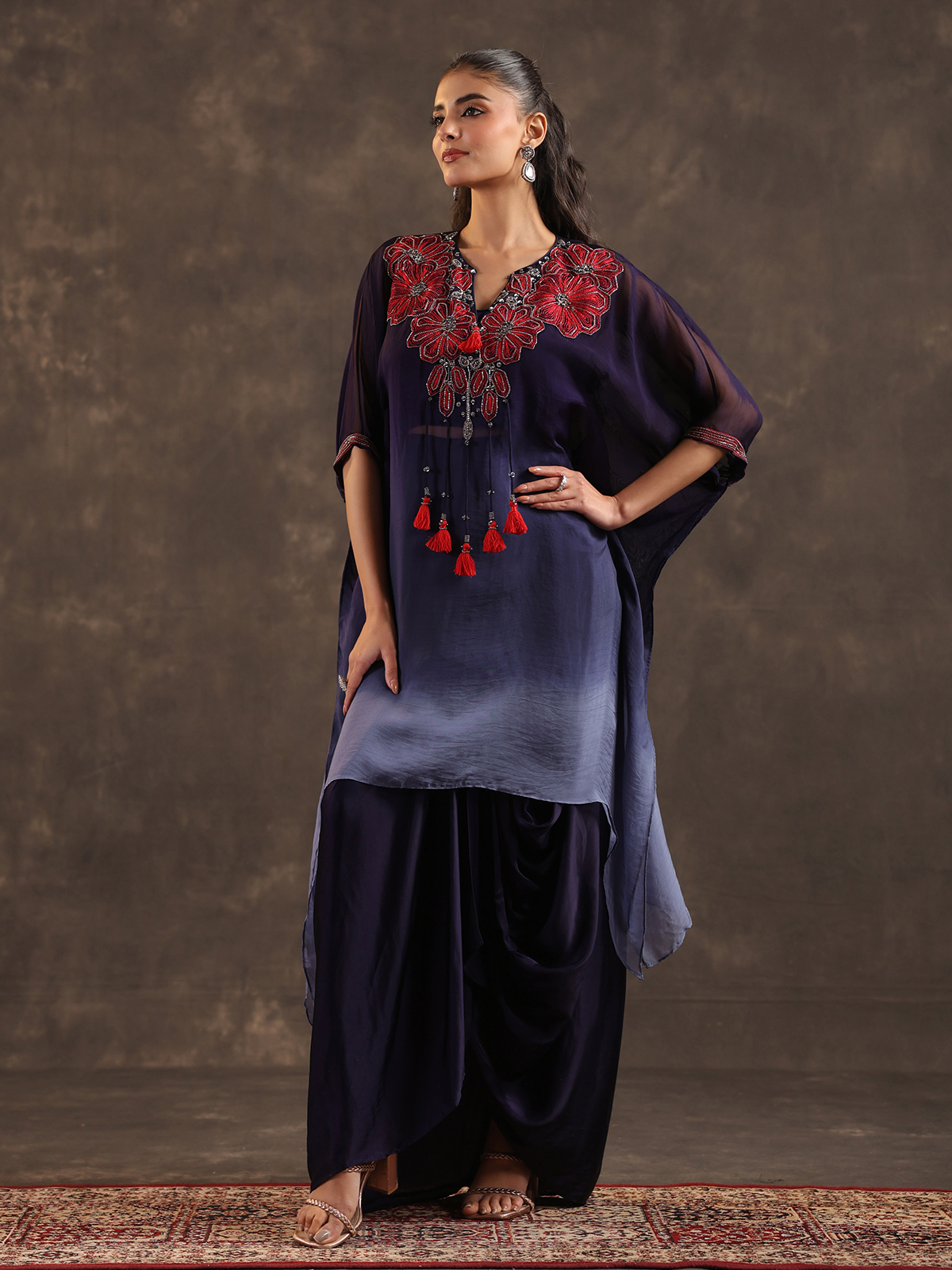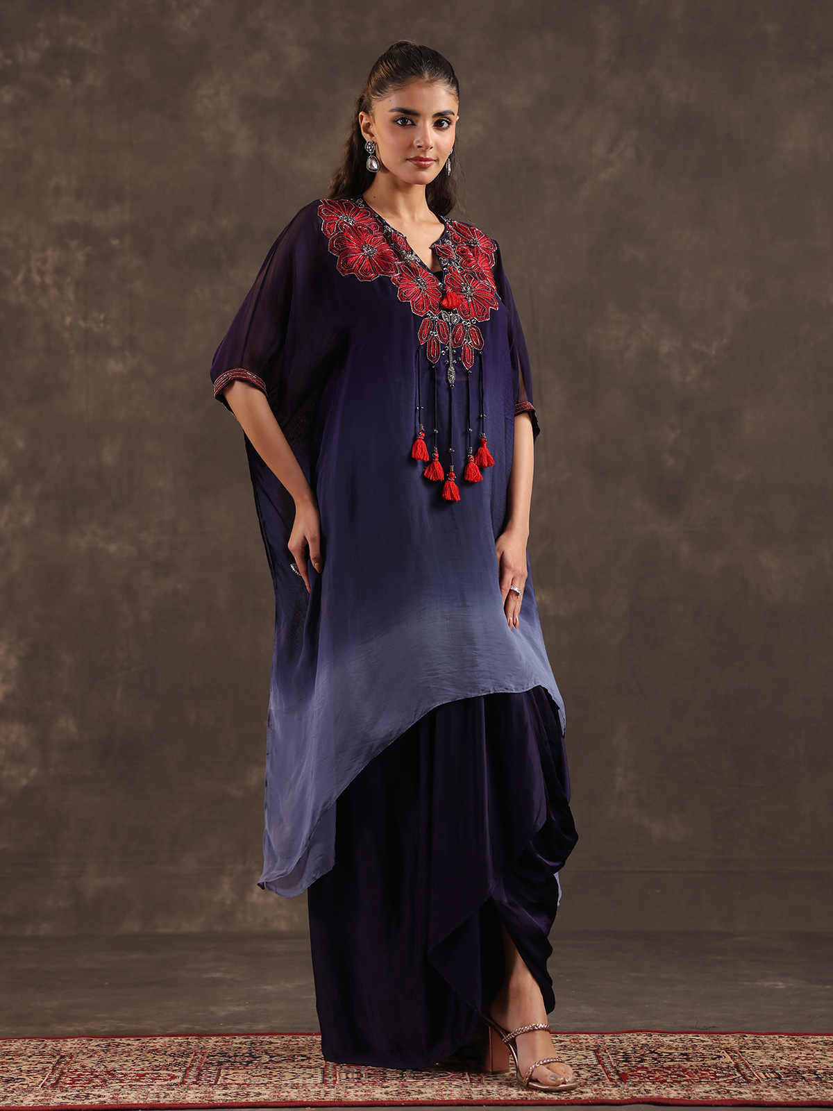Dark Blue Ombre Organza Kaftan Suit With Festive Embellishments