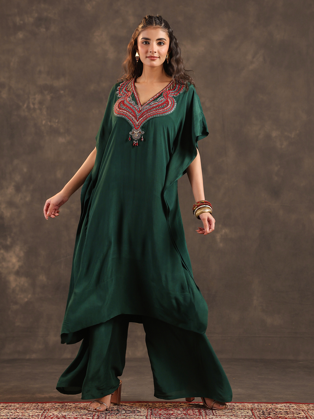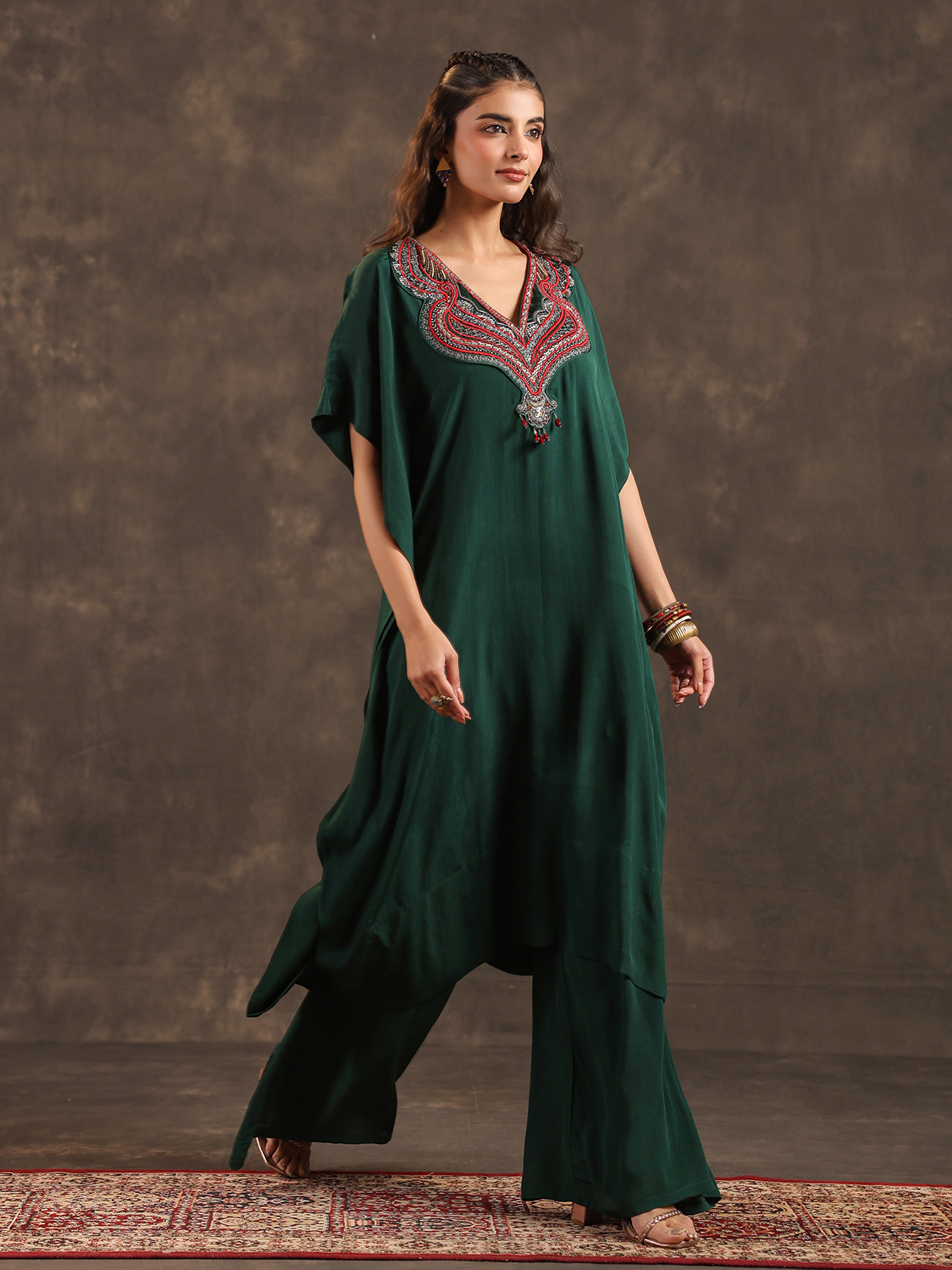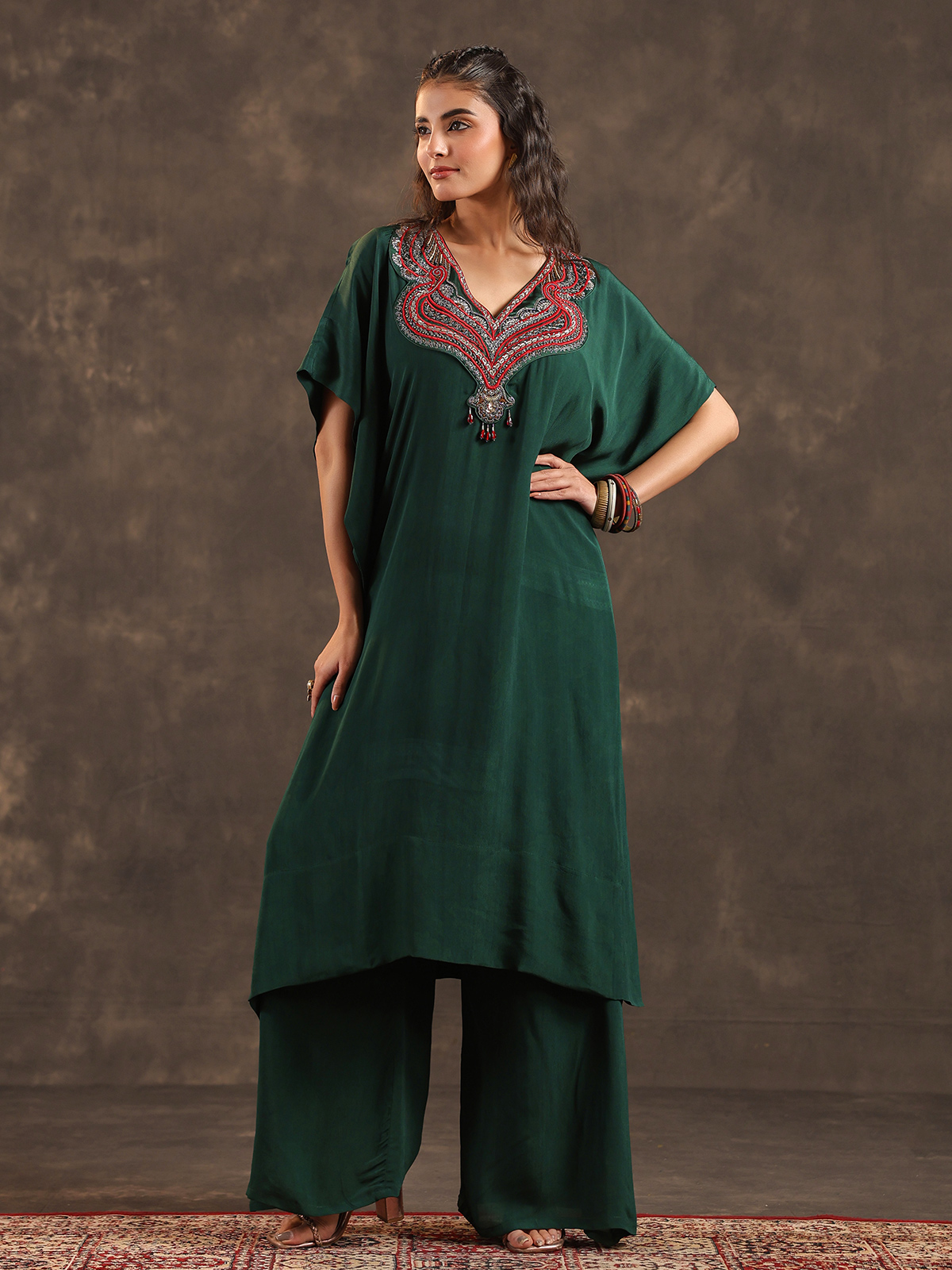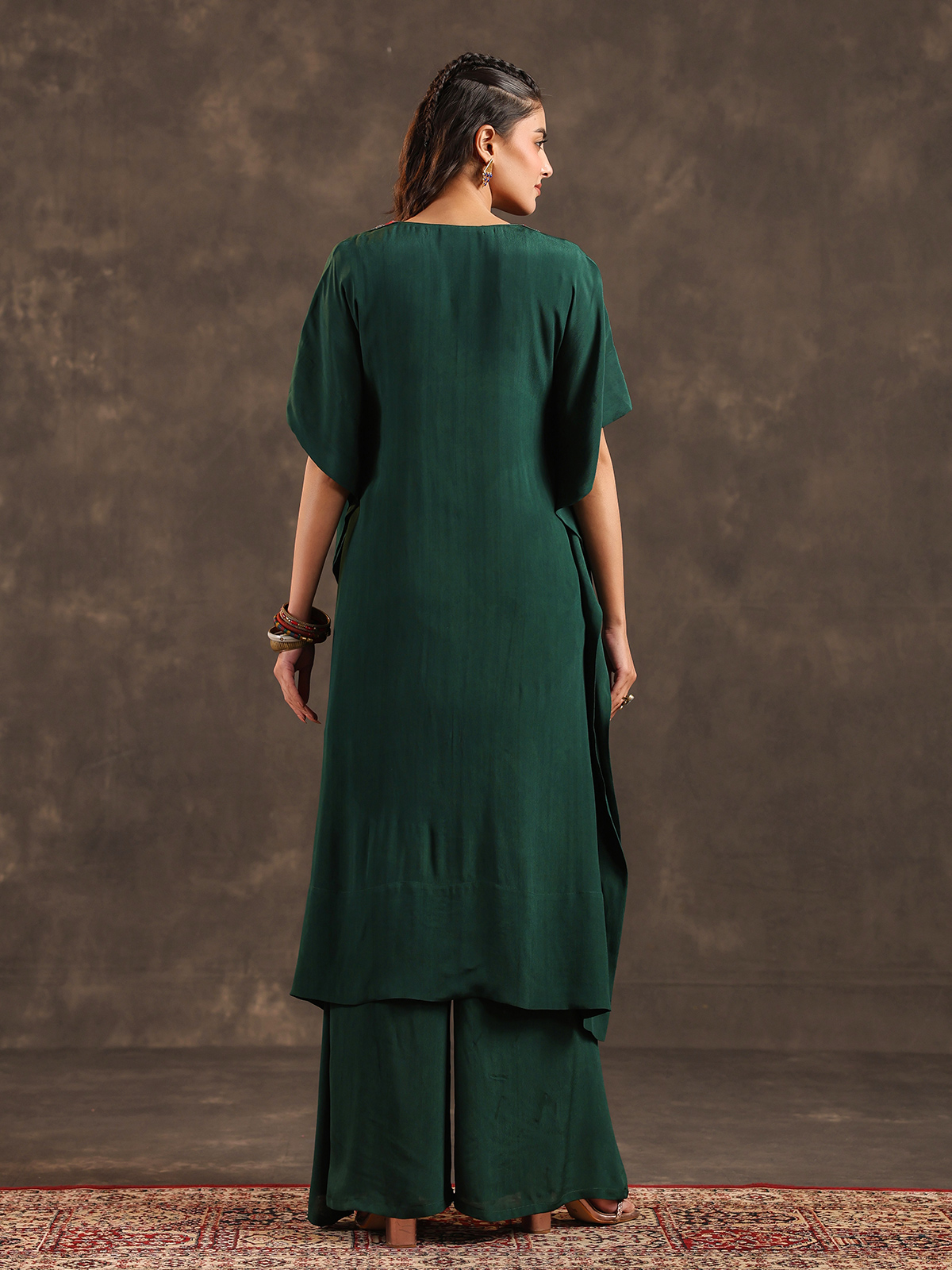 Dark Green Viscose Crepe Kaftan Palazzo Suit With Embellishments