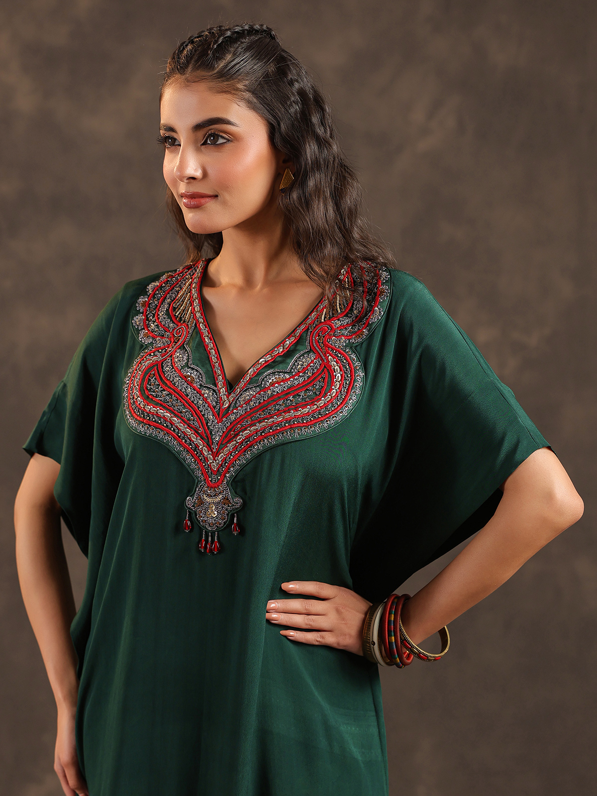 Deep festive tones meet graceful design in this dark green viscose crepe kaftan suit. The V neck silhouette is beautifully adorned with beads, sequins, cutdana, pearls and thread detailing that creates shimmering elegance. Styled with flowing palazzo pants. The ensemble offers a refined ethnic silhouette perfect for weddings, festive celebrations, sangeet evenings and joyful Eid gatherings.