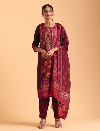 A dark grey silk salwar suit enhanced with stone, sequins and cutdana embellishment over a printed base. Quarter sleeves and pant bottoms with dupatta lend easy festive charm for celebrations.