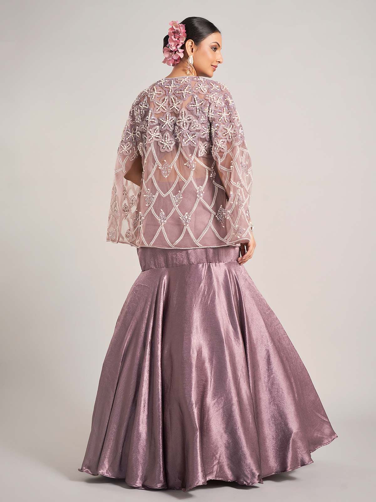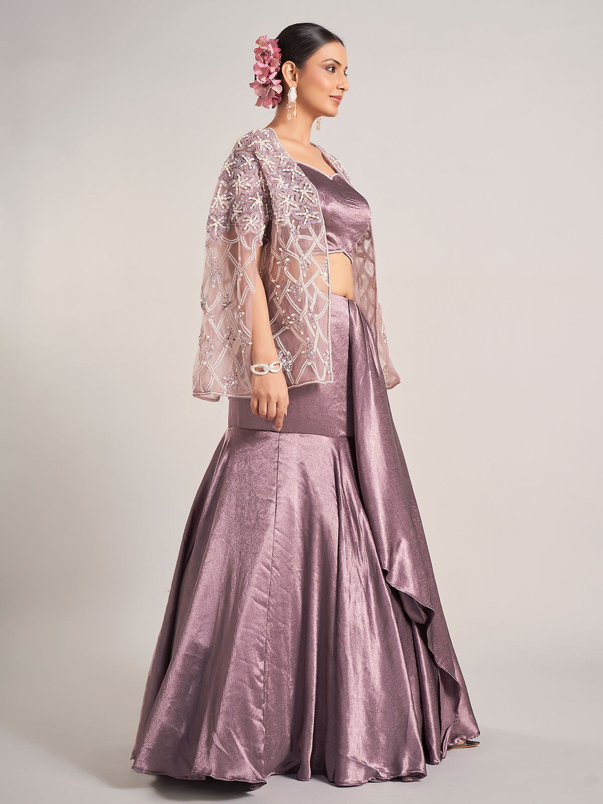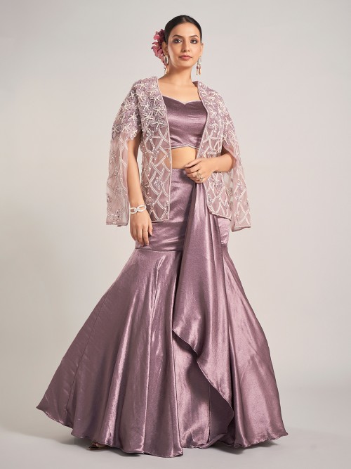 Exude majestic sophistication in this dark purple tissue organza Indowestern, styled with an elegant jacket richly embellished with beads, sequins, and cutdana work. Designed for weddings and receptions, it offers a luxurious fusion of tradition and modernity, ensuring a captivating presence at grand celebrations.