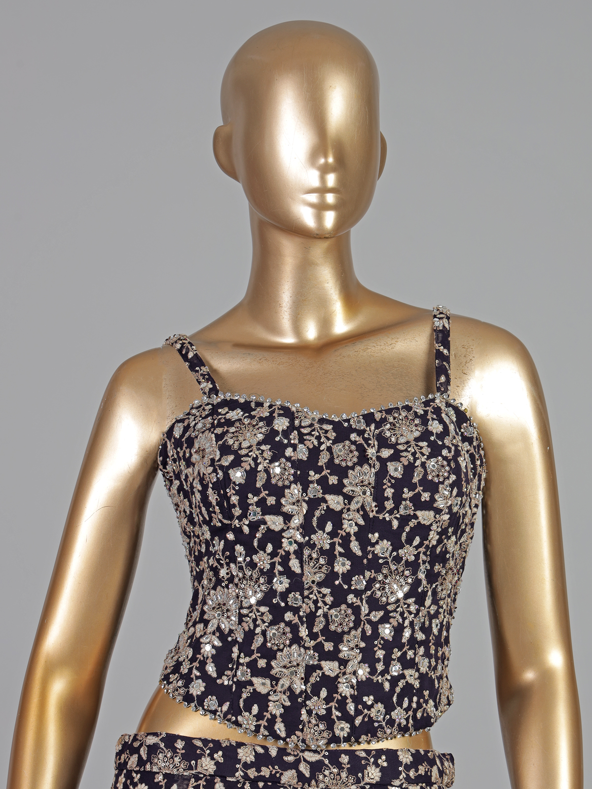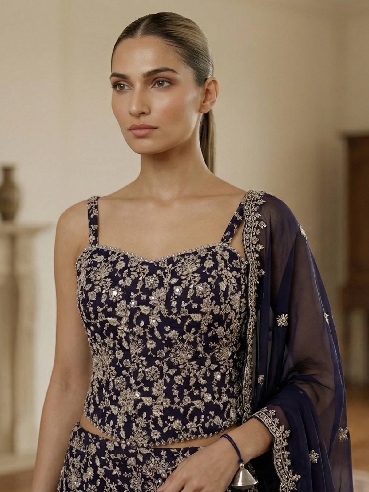 Deep dark purple bring regal charm to this georgette palazzo suit crafted for festive wear. Embellished with embroidery, sequins, mirror and stone work. It reflects luxurious detail. The sweetheart neckline and sleeveless design create a sleek silhouette. Paired with a dupatta. It is ideal for weddings and sangeet.