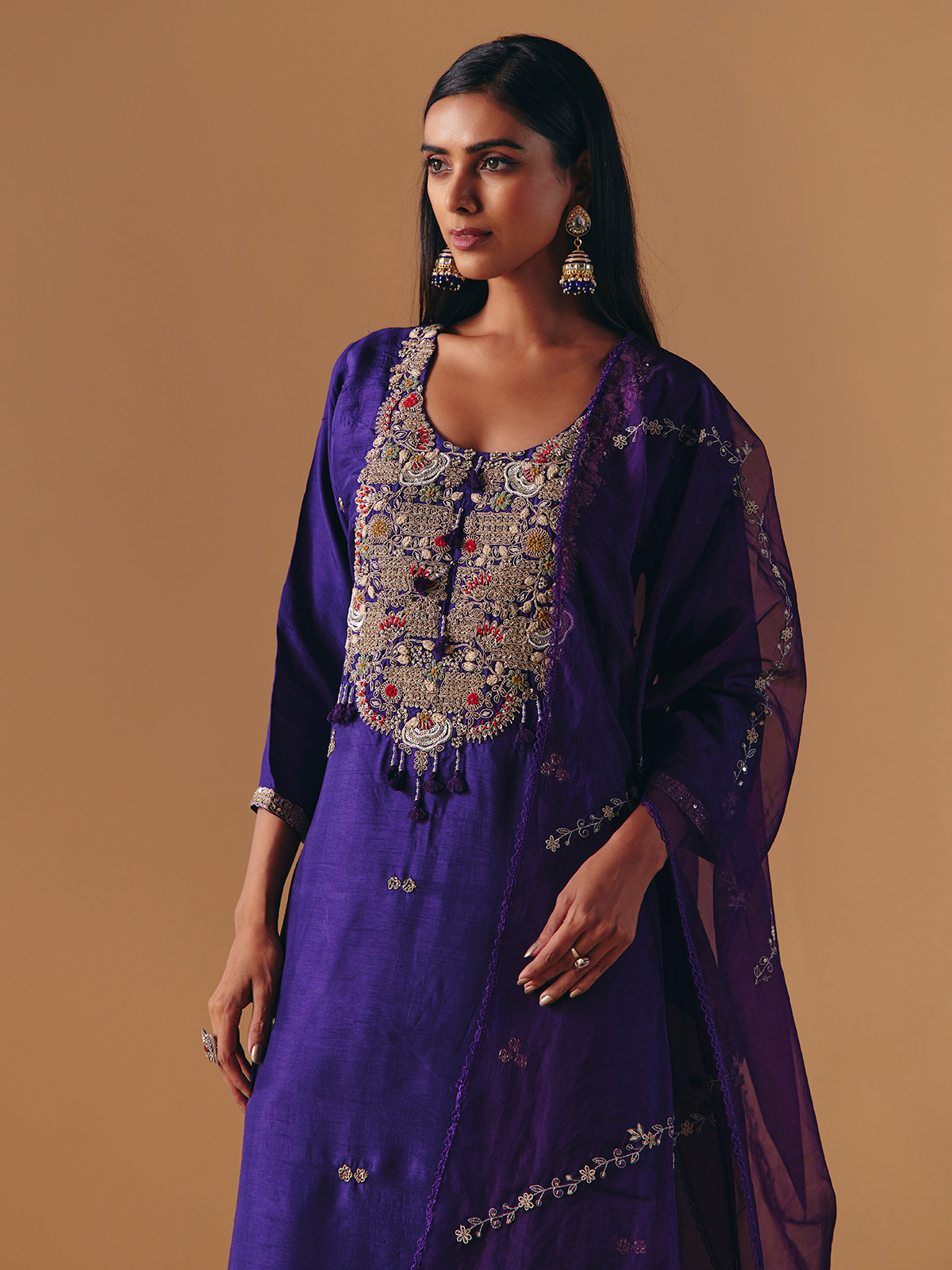 Exquisite dark purple silk meets shimmering sequins, beads, zardosi, and thread work in this palazzo-style salwar suit. With a round neckline, quarter sleeves, and matching dupatta, it radiates wedding and festive elegance with every graceful detail.