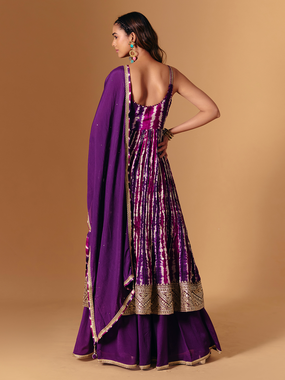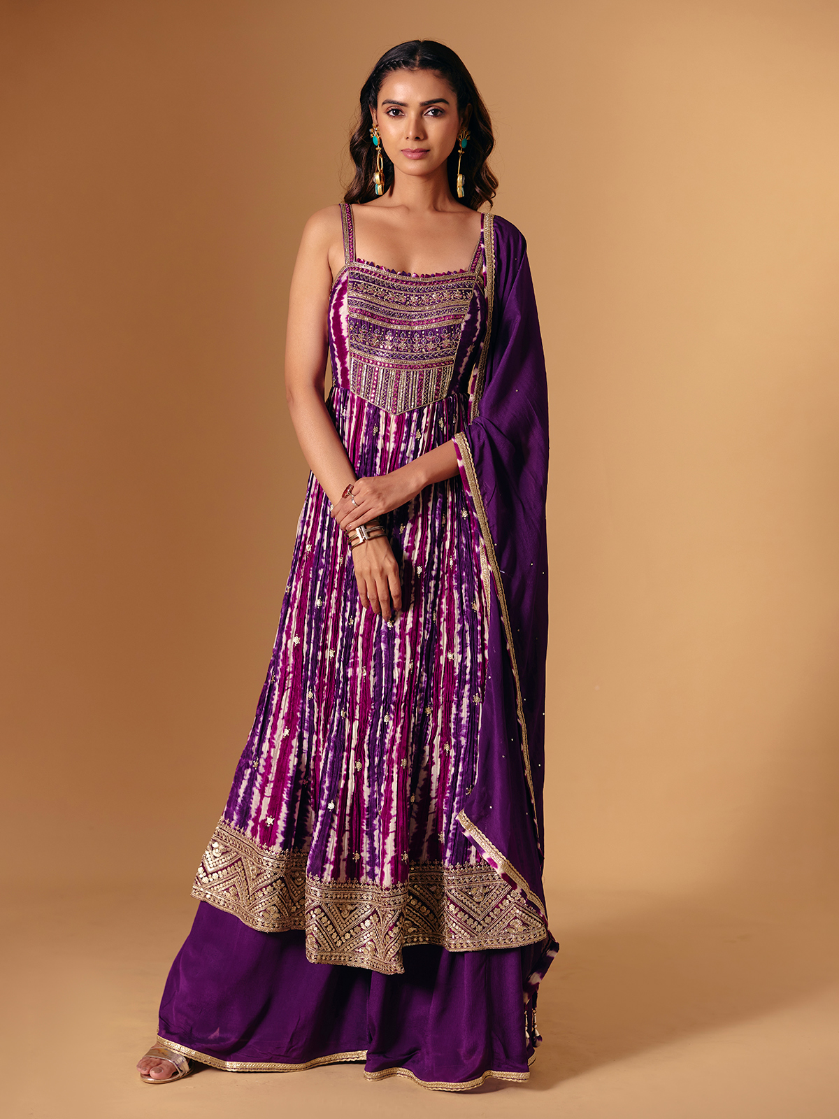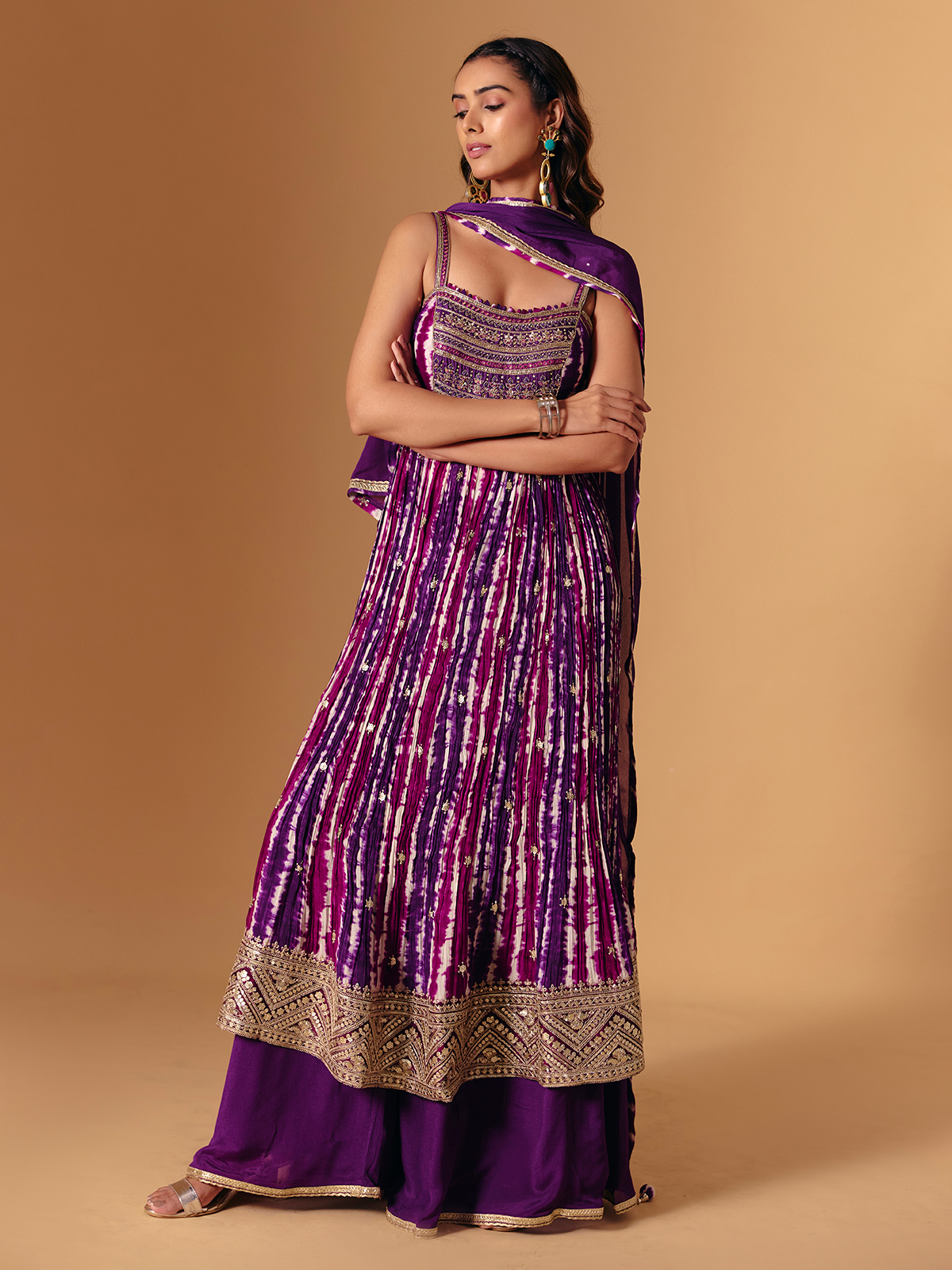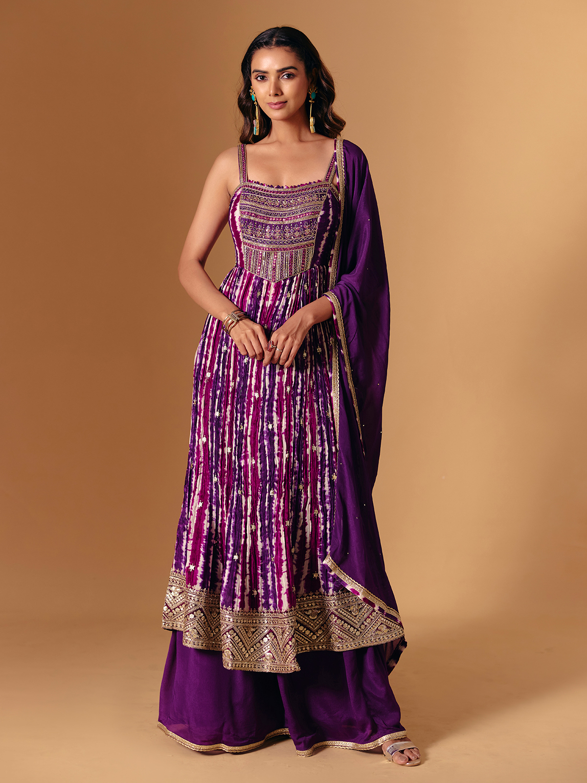 Regal and radiant, this dark purple silk palazzo suit is embellished with sequins, aabla, and zardosi detailing. Its printed dupatta adds a graceful flow—crafted for weddings and receptions where every movement reflects sophistication and timeless beauty.