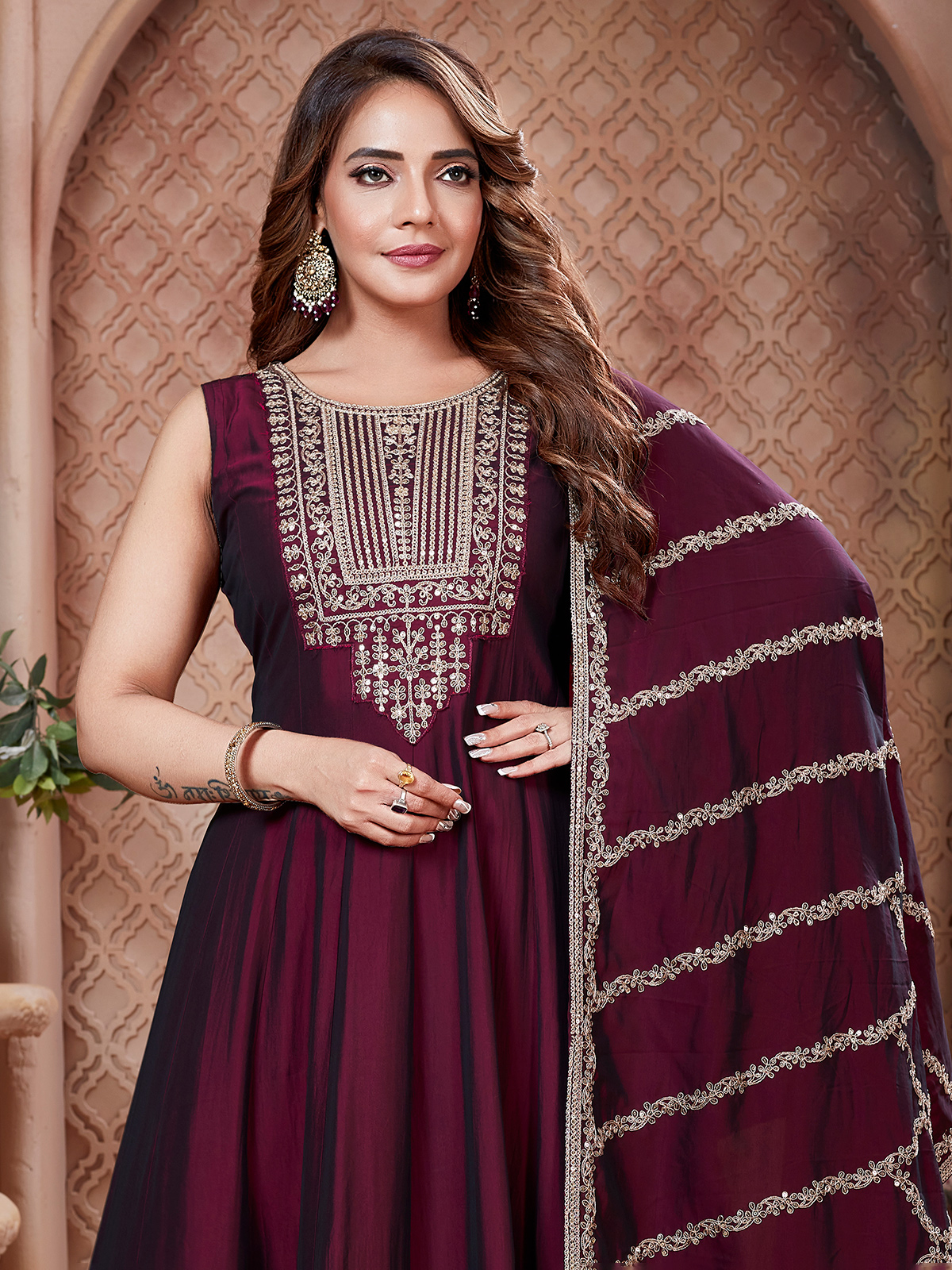 A royal choice, this dark purple silk salwar suit is delicately embroidered with resham, thread, and sequins. Featuring a sleeveless cut, round neck, pants, and dupatta—great for cultural festivities.