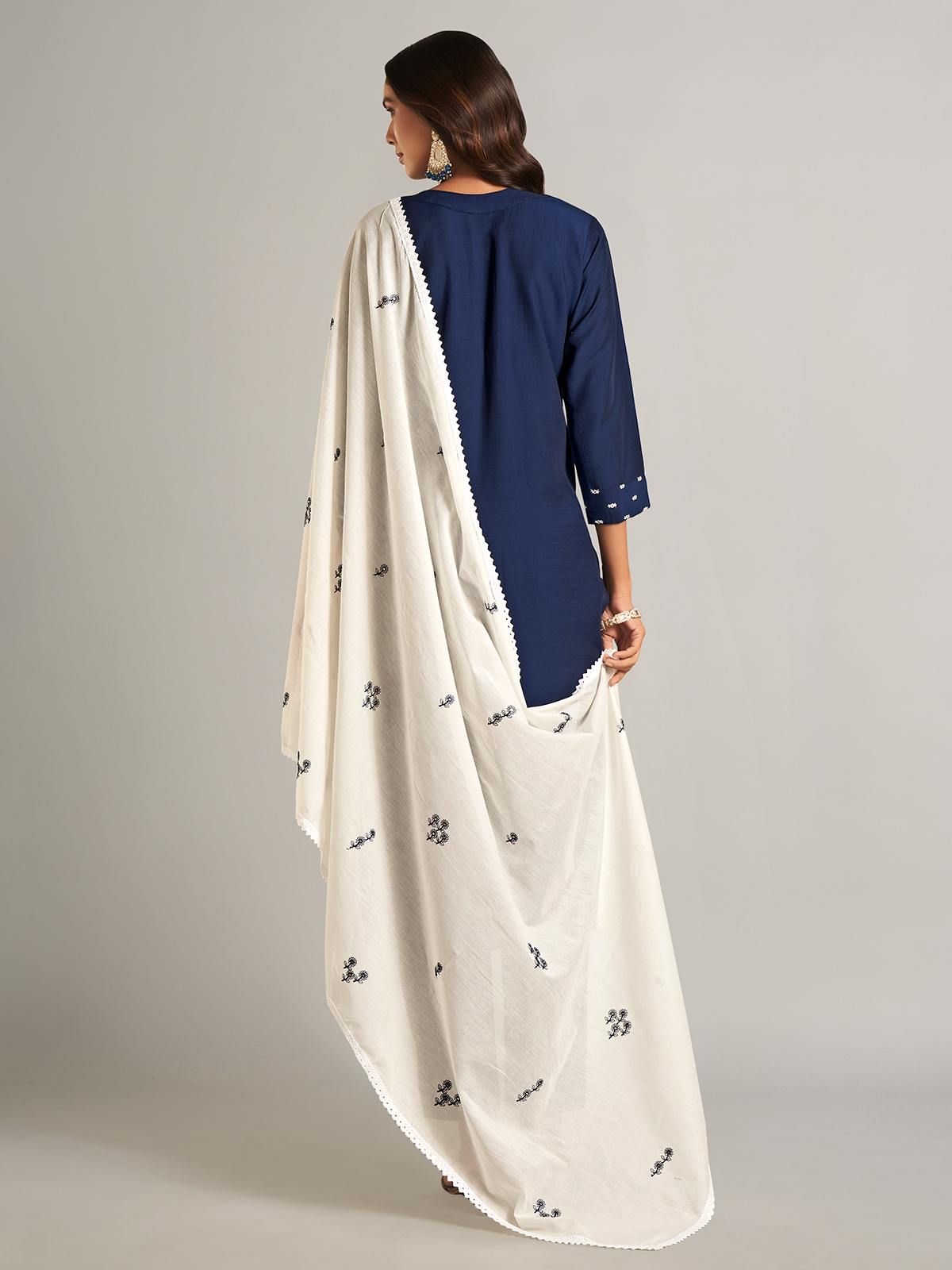 Step into elegance with this navy silk salwar suit, beautifully embellished with thread and sequins work. The round neckline and quarter-sleeve design create a sophisticated look that’s perfect for both casual and formal events.