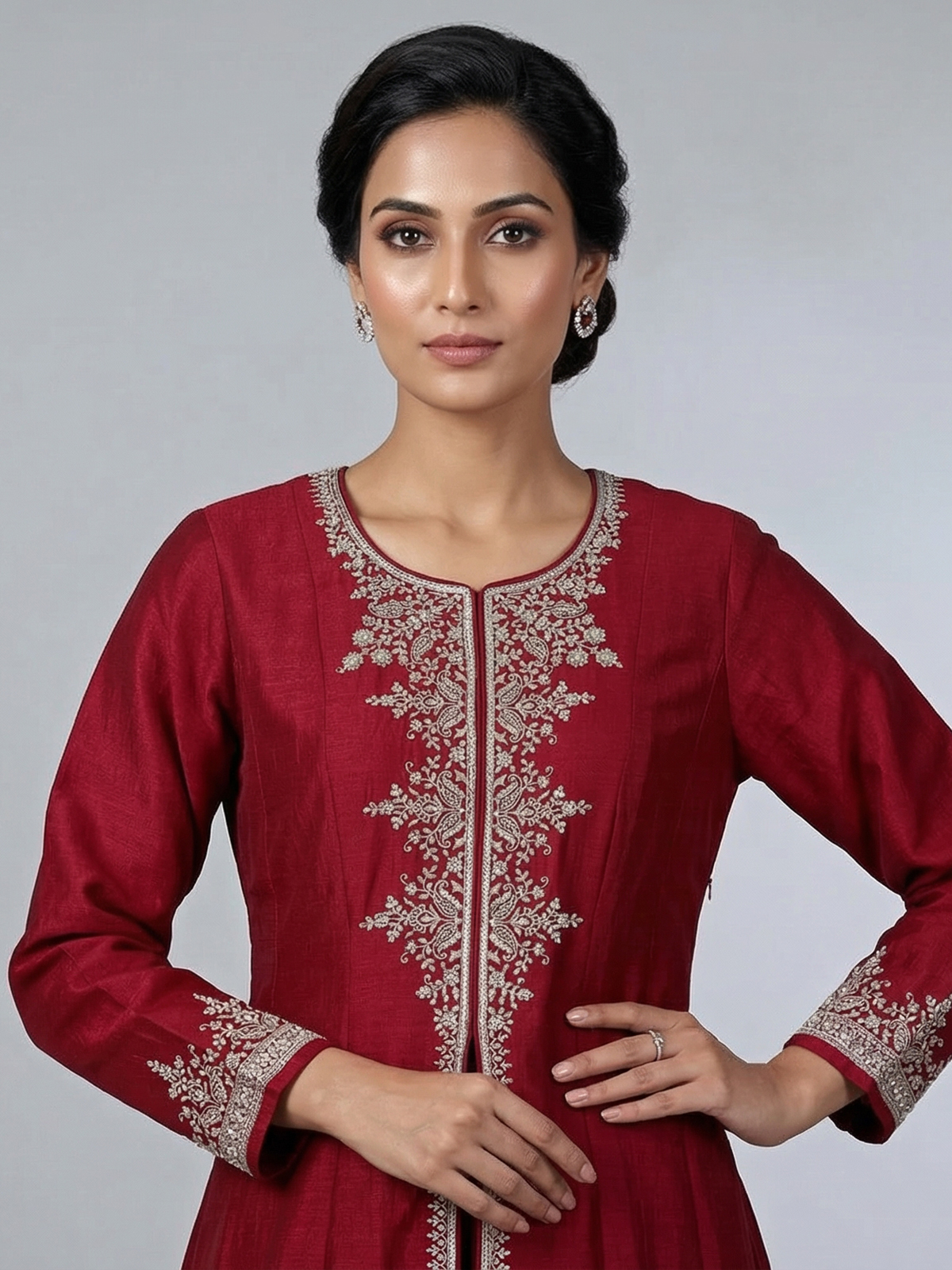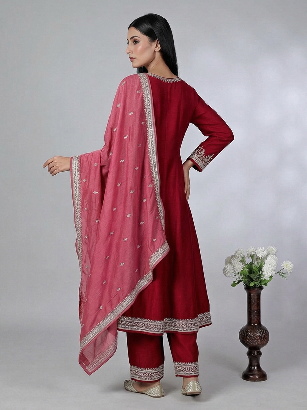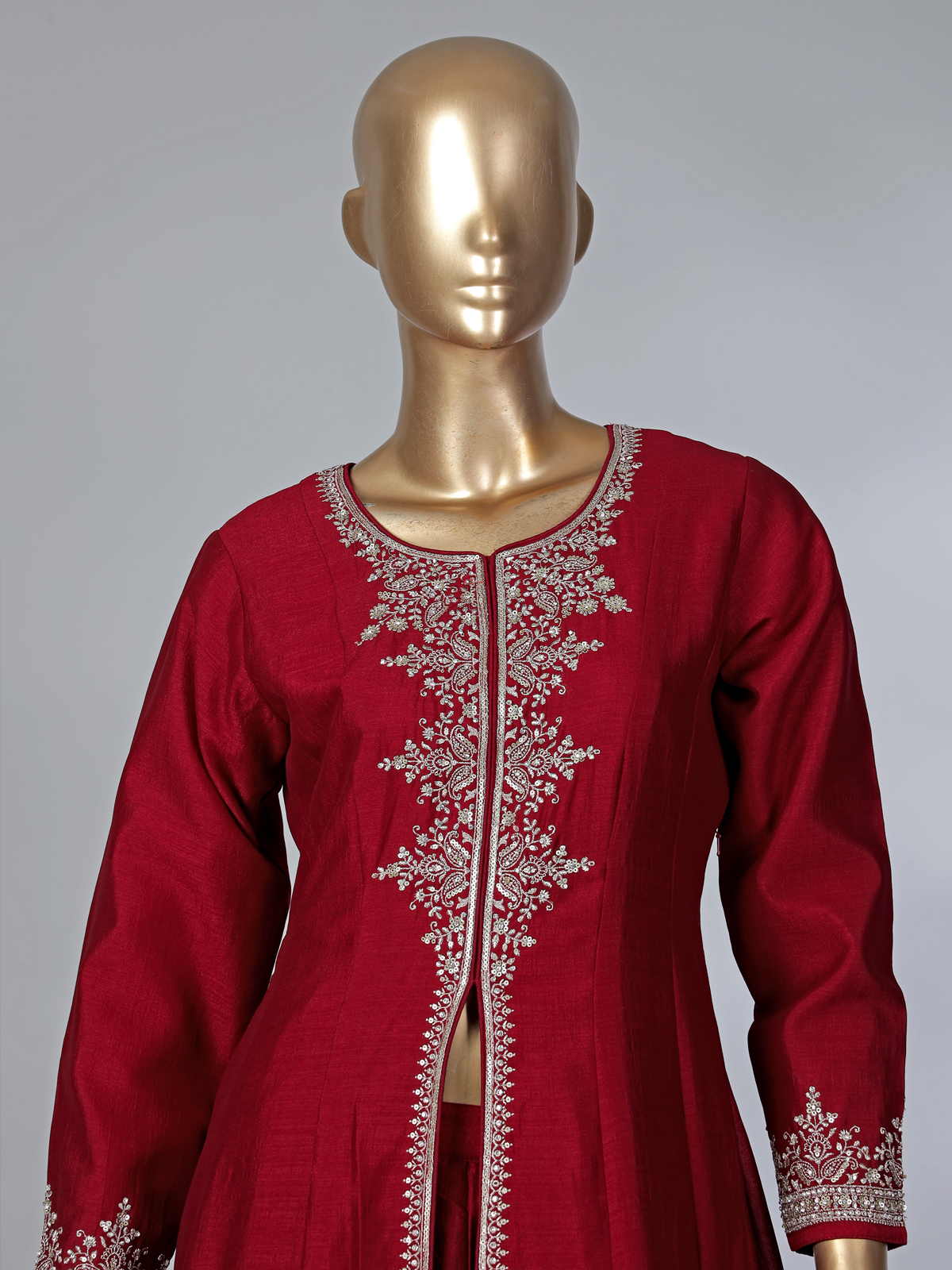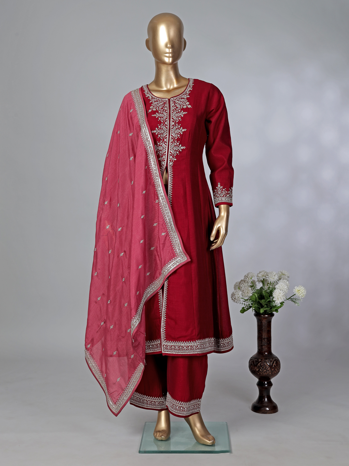 Deep Red Silk Festive Palazzo Suit With Embroidery And Dupatta
