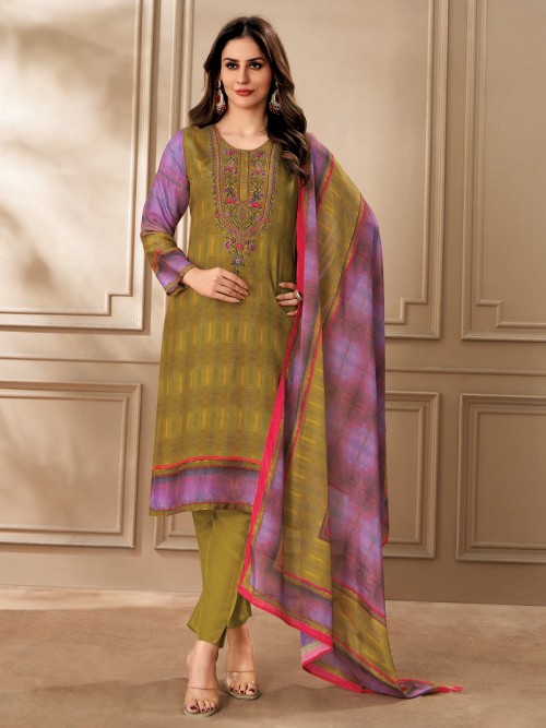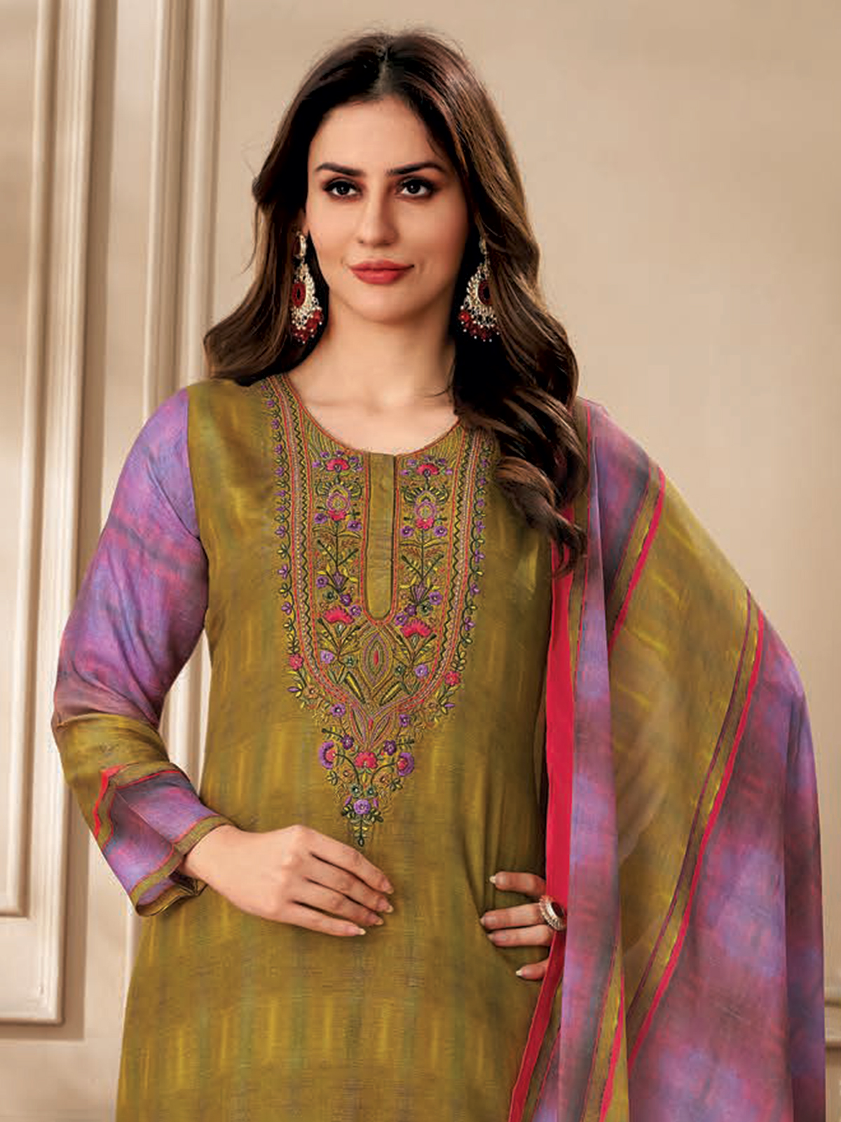 Elegant Olive Dola Silk Suit With Intricate Prints
