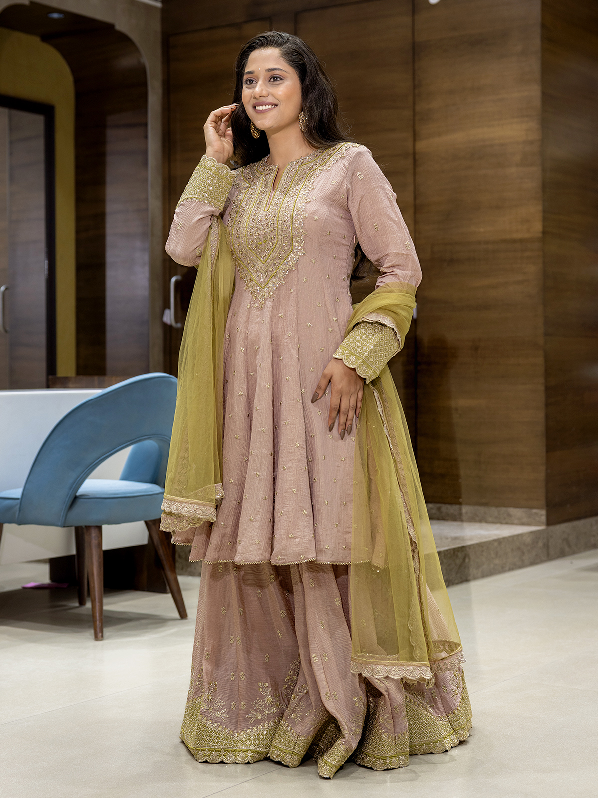 Celebrate tradition with ethnic charm in this peach palazzo suit, tailored from premium silk and adorned with resham, sequins, beads, and cutdana. The subtle sparkle complements the rich texture, while the matching palazzo and contrasting light green dupatta complete the ensemble beautifully. Must wear in day festival or night event for a sparkling and classy look.