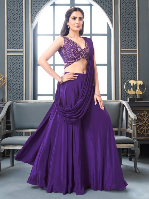 Stay classy with this elegant purple silk palazzo suit with attached drape. The zardosi, mirror, resham and sequins work add a touch of sophistication.