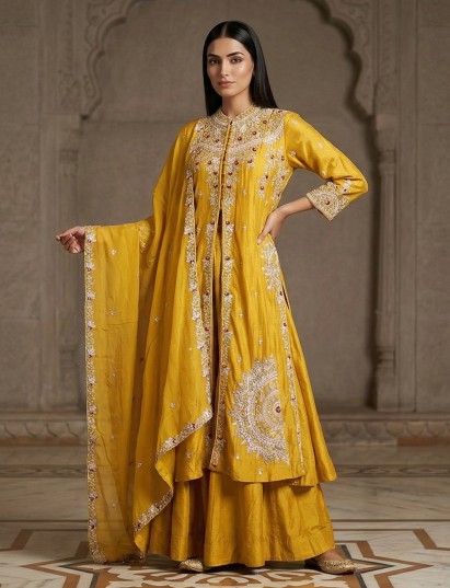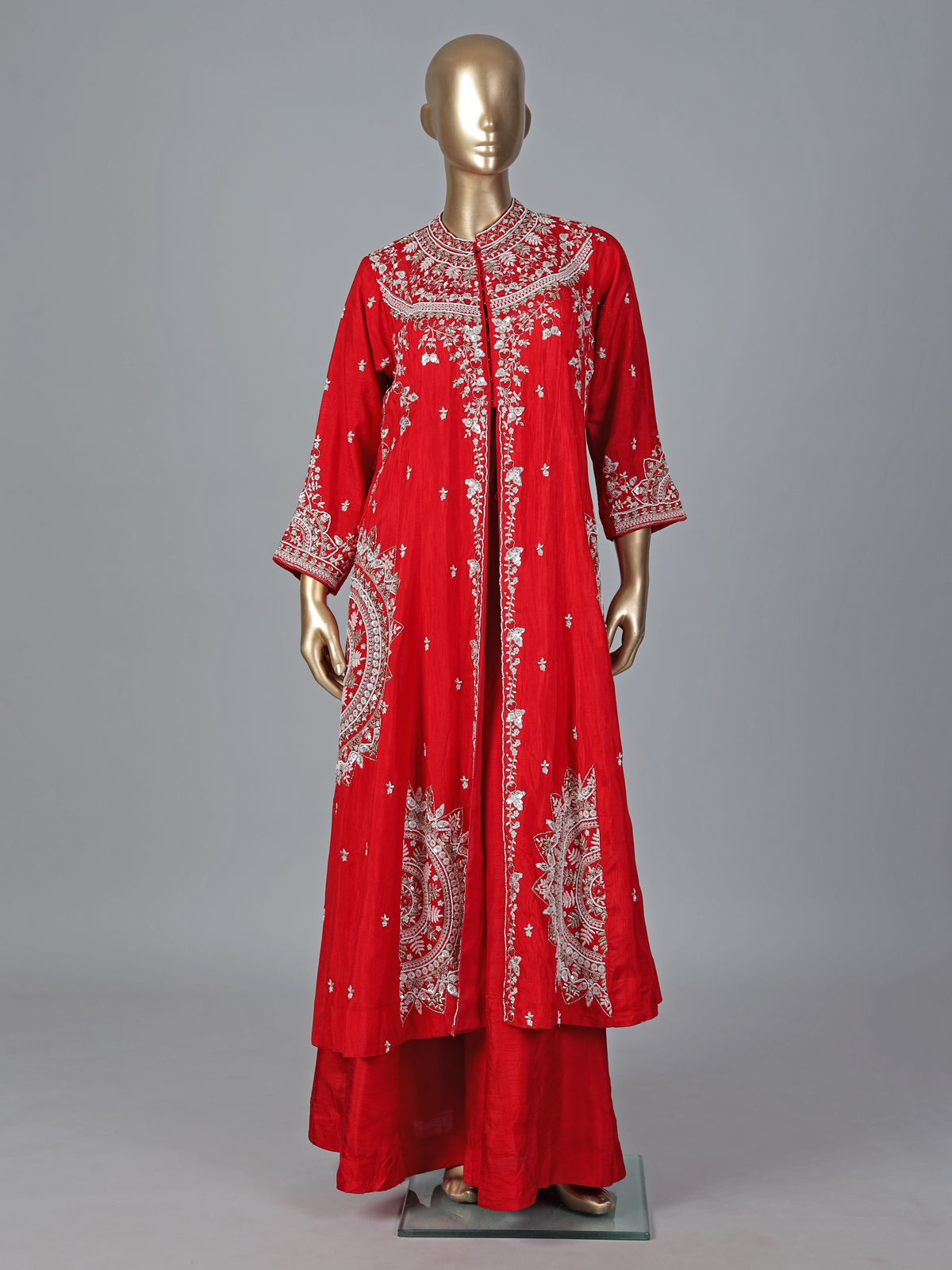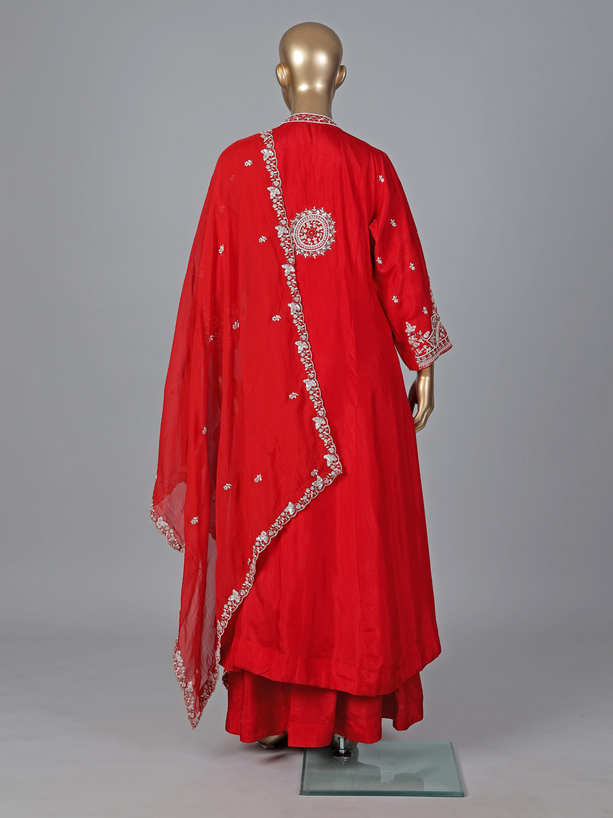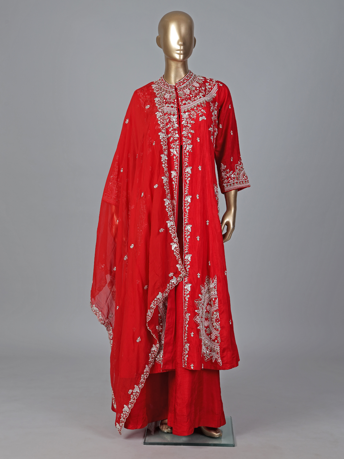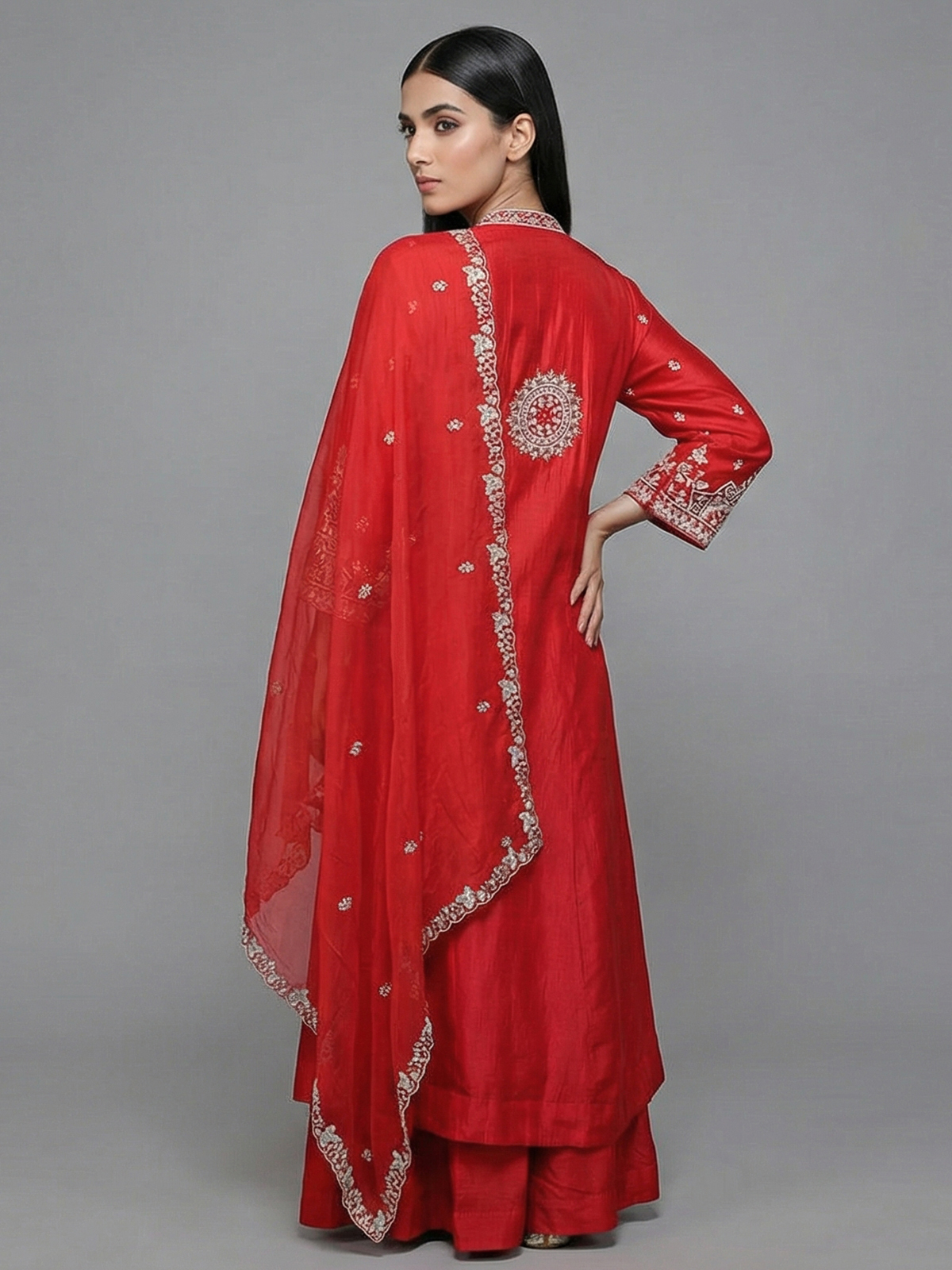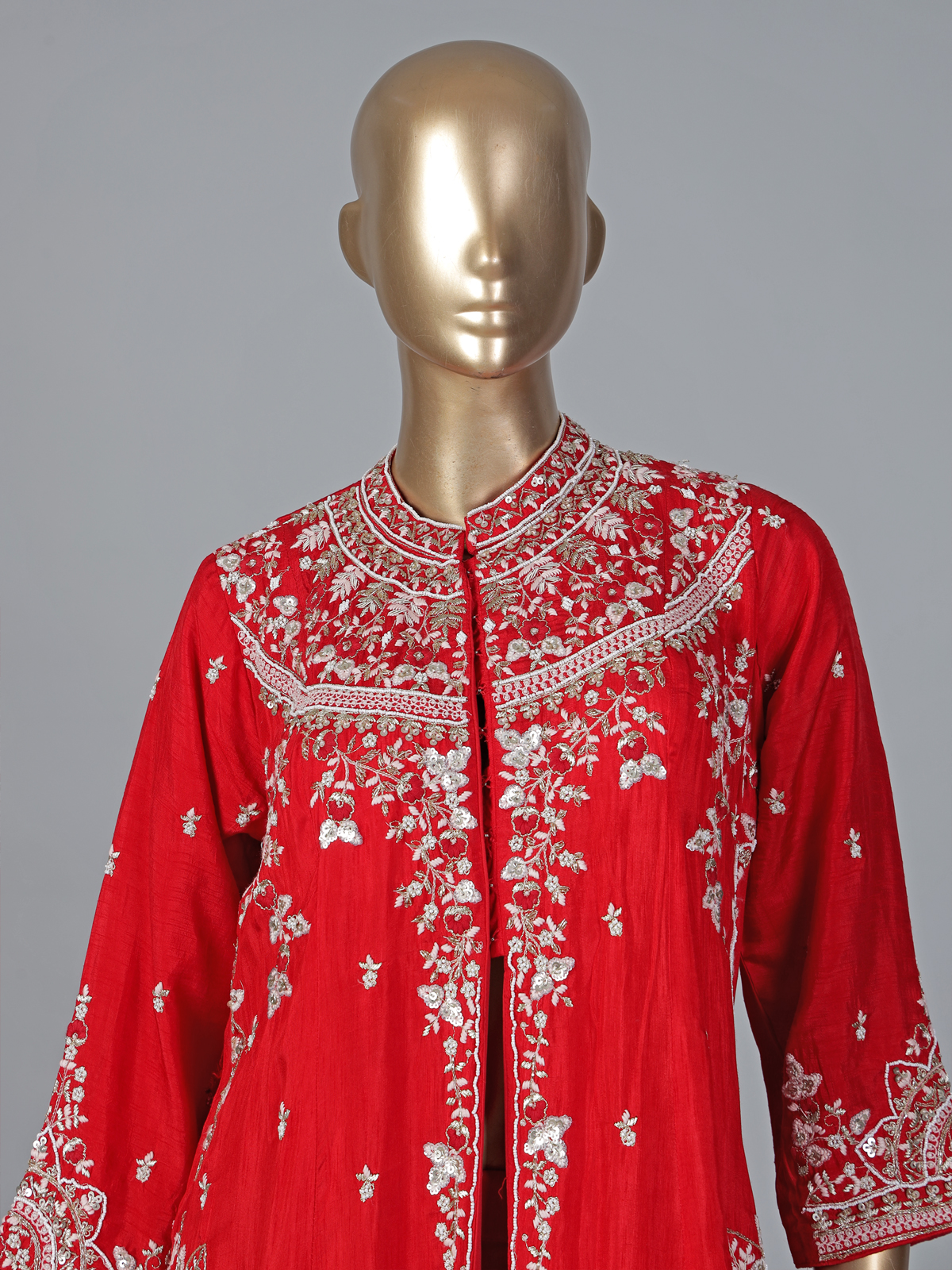 Step into wedding elegance with this stunning red raw silk palazzo suit, adorned with sequins, beads, cutdana and resham work that create a rich festive sparkle. Designed with a classic round neckline and quarter sleeves, it comes paired with coordinated bottoms and a graceful dupatta.