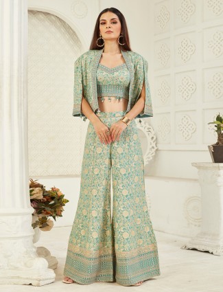 Embrace festive elegance in this green silk palazzo suit featuring intricate embroidery, zari, resham, beads, tassels, and mirror highlights. The chic crop top with a stylish embroidered jacket creates a perfect fusion of tradition and modern flair, making it ideal for weddings, receptions, and joyous celebrations with timeless sophistication.