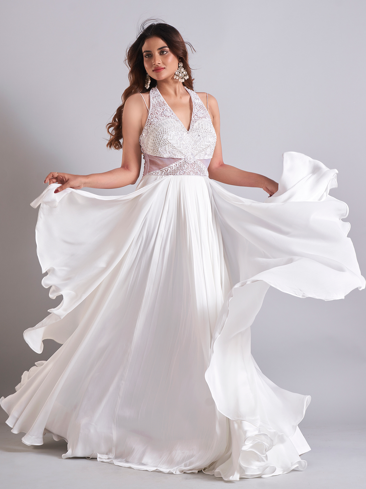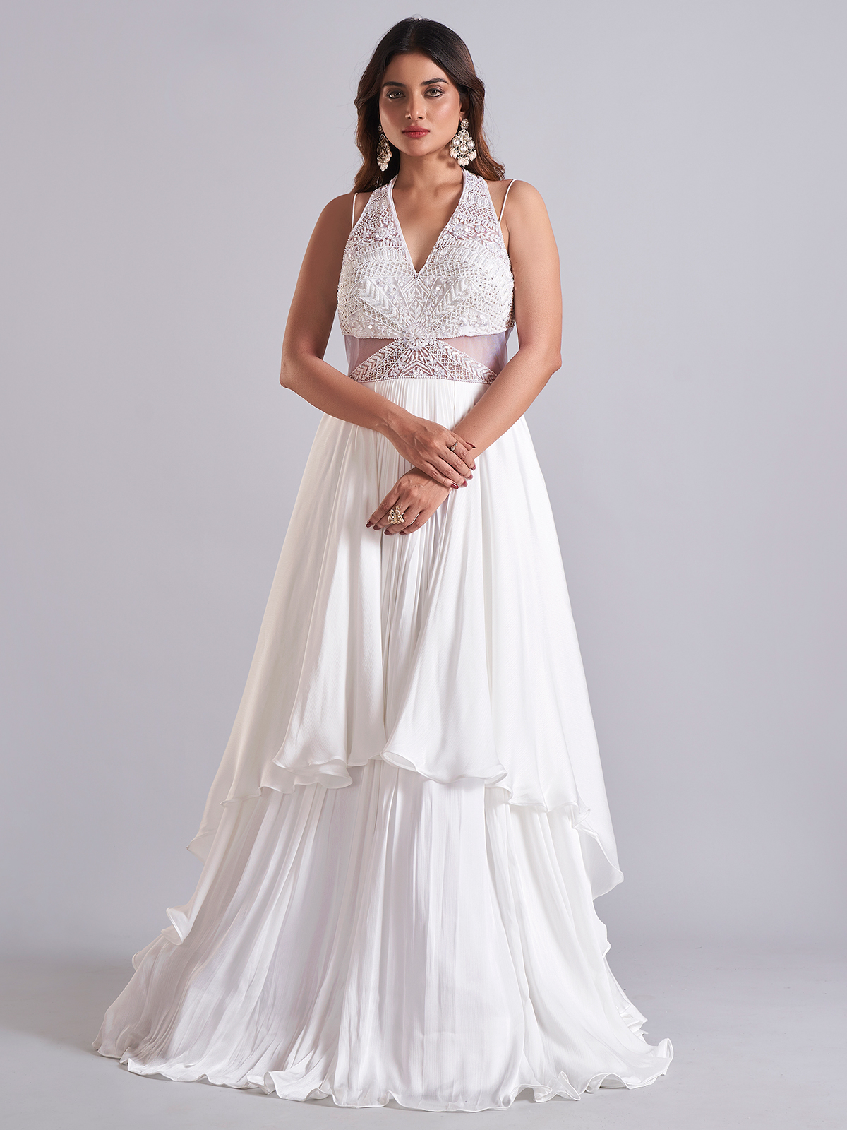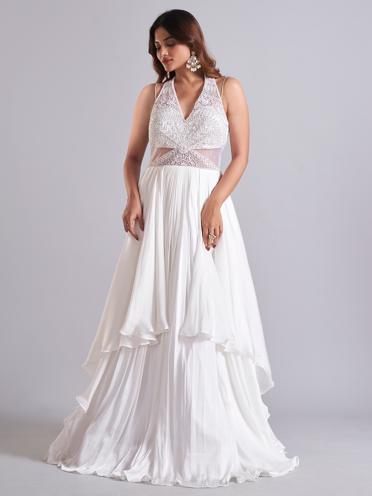 Step into elegance with this beautiful white silk floor-length designer salwar suit, ideal for wedding ceremonies. Intricately embellished with cutdana, sequins, beads, and stonework, it features a flattering V-neck and sleeveless silhouette, offering a refined and timeless look.