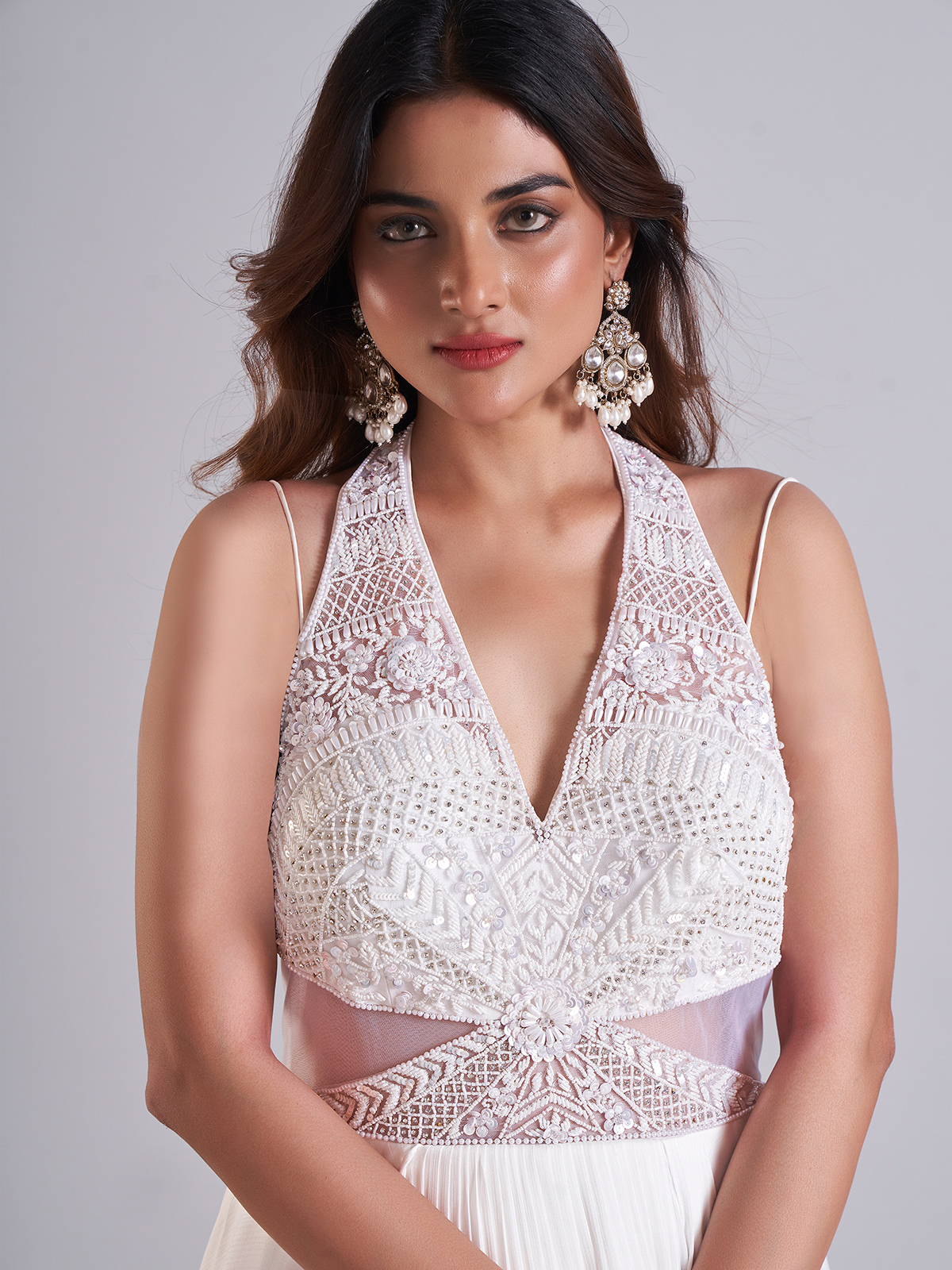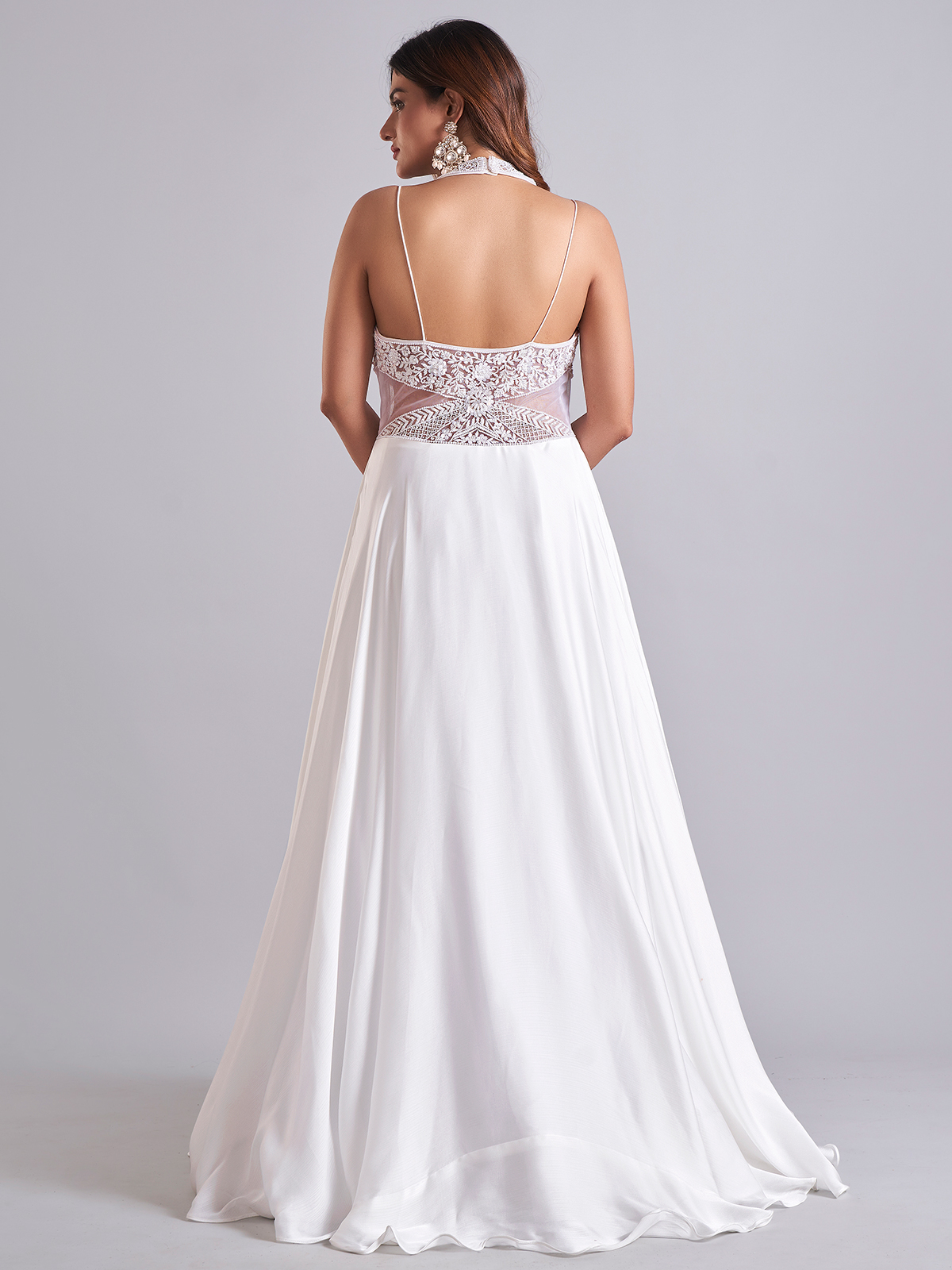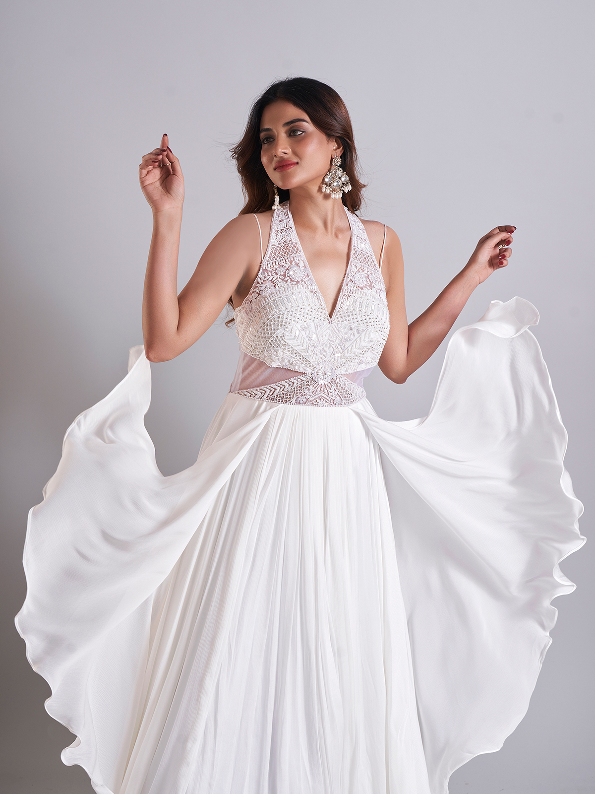 Step into elegance with this beautiful white silk floor-length designer salwar suit, ideal for wedding ceremonies. Intricately embellished with cutdana, sequins, beads, and stonework, it features a flattering V-neck and sleeveless silhouette, offering a refined and timeless look.