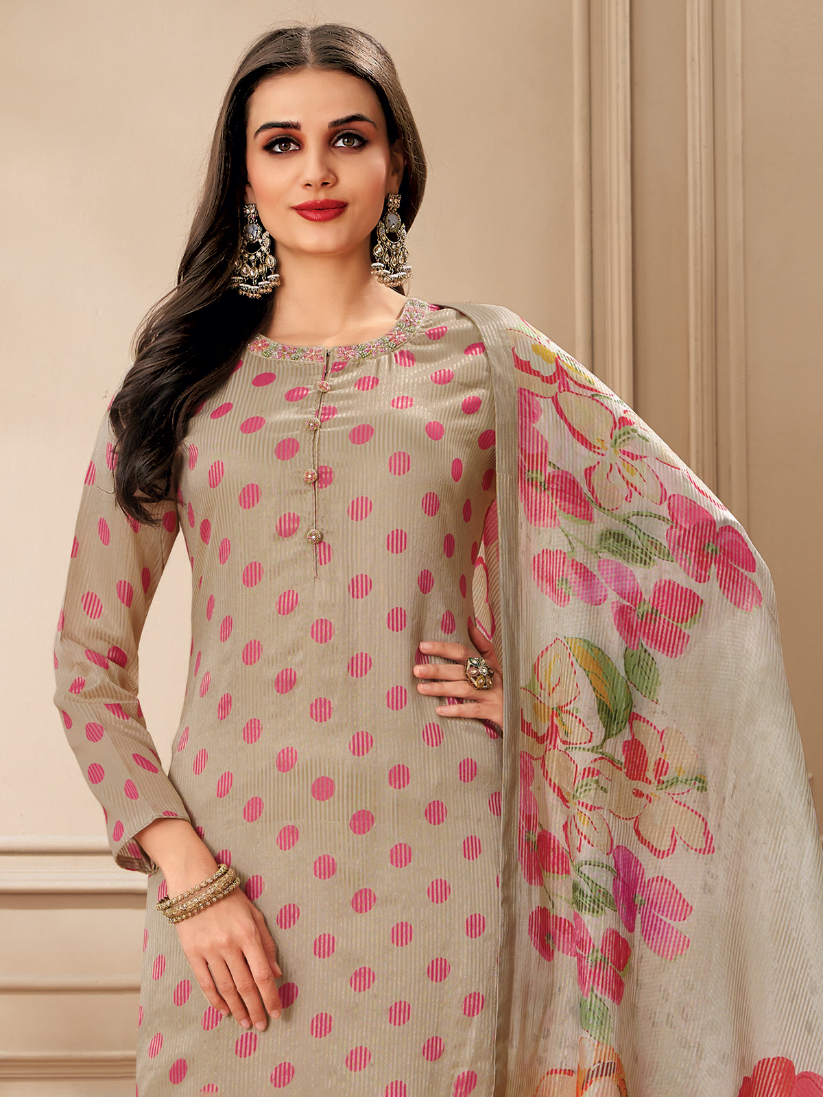 For an effortlessly elegant look, choose this dark beige printed salwar suit. The rich silk fabric is embellished with delicate beadwork and cutdana detailing, offering a subtle festive shine. Designed with a round neck and quarter sleeves, the suit is both classic and graceful. An ornate dupatta with elaborate borders completes this regal ensemble.