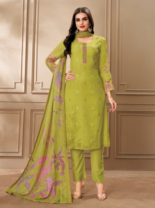 Experience a blend of tradition and comfort with this green cotton salwar suit. Featuring a charming print, round neckline, and quarter sleeves, this outfit is beautifully finished with a matching bottom and dupatta perfect for the festive season.