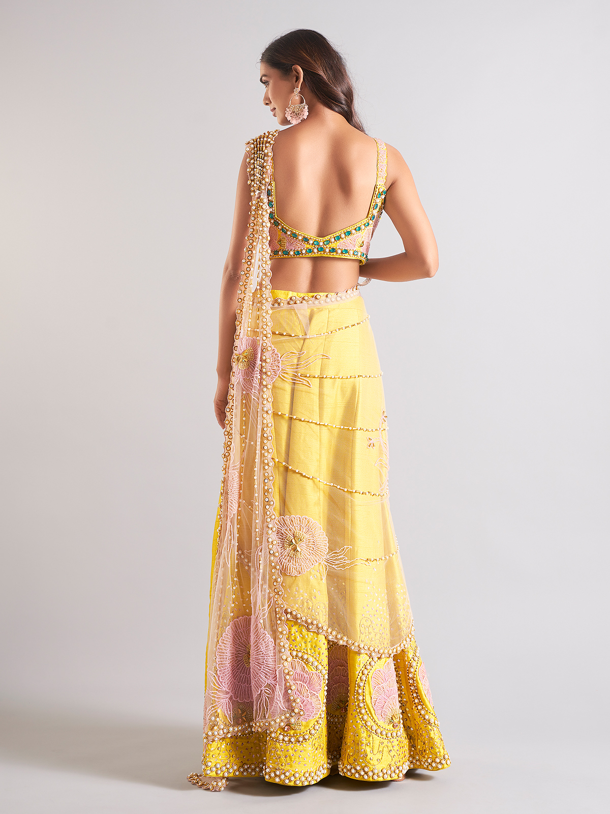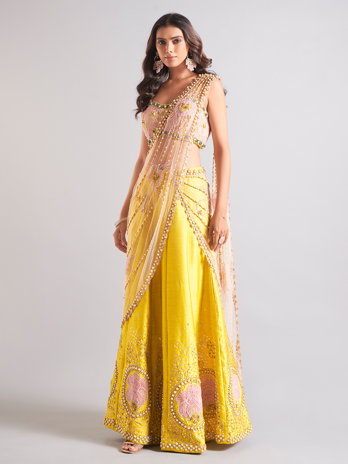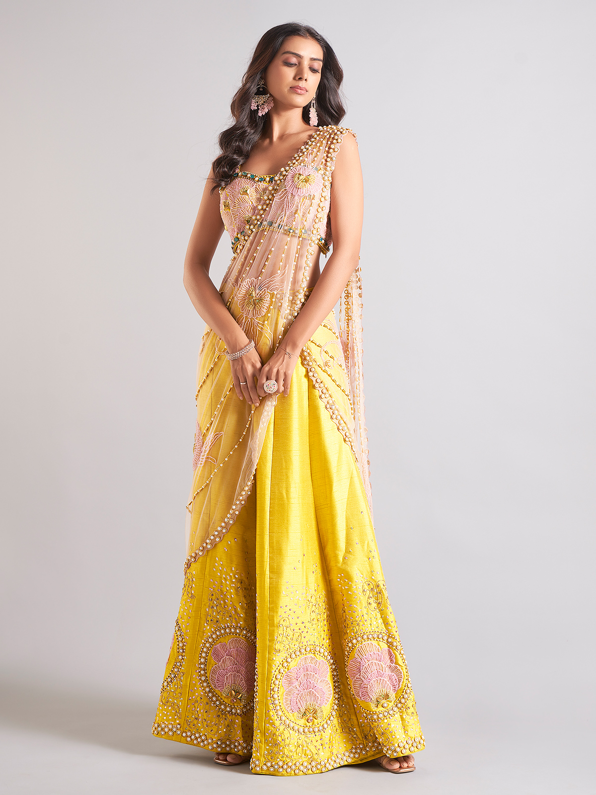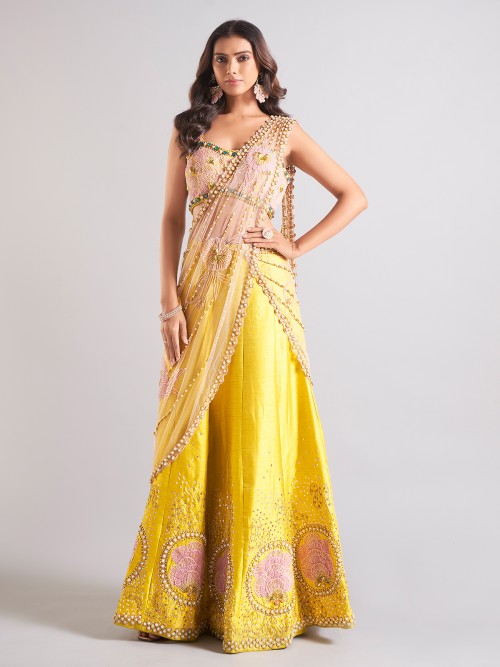 Our gorgeous yellow raw silk palazzo suit, adorned with exquisite cutdana, sequins, beads, and pearl work, is sure to turn heads. This sophisticated item, which comes with a ready-made blouse for your convenience, is ideal for weddings.